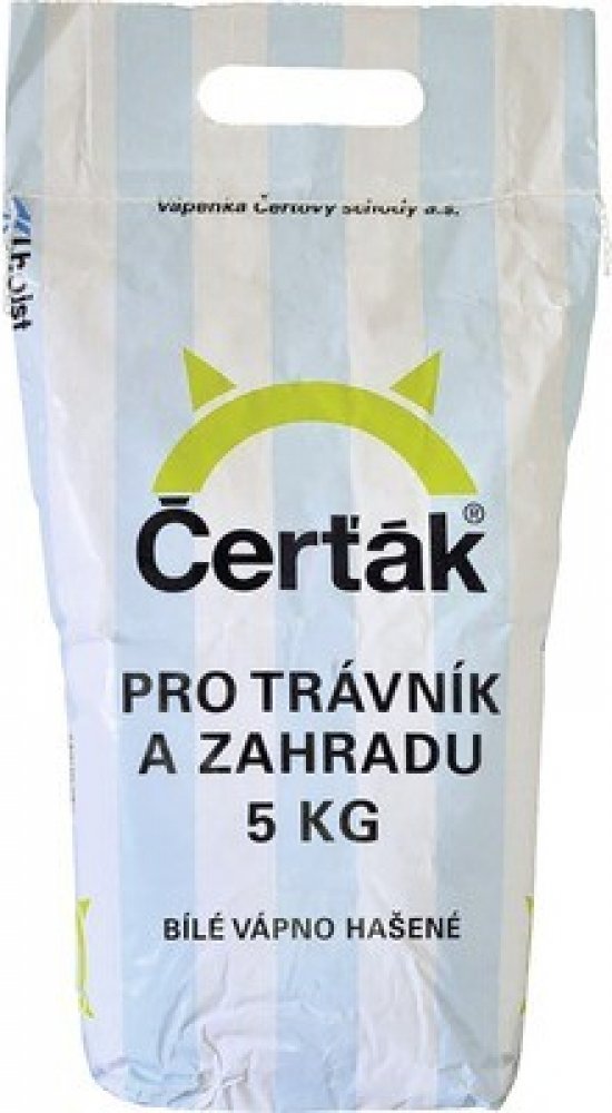 Vápno Čerťák hašené 5 kg bílé pro trávník a zahradu Vápno vyráběné v berounské oblasti je po staletí známo jako kvalitní materiál s vysokou bělostí. Jedním z materiálů, kterým Vápenka Čertovy schody navazuje na tuto tradici, je vápenná suspenze Čerťák®. Čerťák® je hašené bílé vápno, určené k přímému použití – nemusí se již hasit ani předem namáčet. Použití Všechny typy půd a většina rostlin (s výjimkou rostlin kyselomilných) Dodává do půdy vápník a významným způsobem upravuje půdní kyselost Zlepšuje a zvyšuje kvalitu sklizně Podporuje lepší využití hnojiv, stabilizuje půdní strukturu Umožňuje lepší hospodaření s vláhou půdy, posiluje její biologickou aktivitu