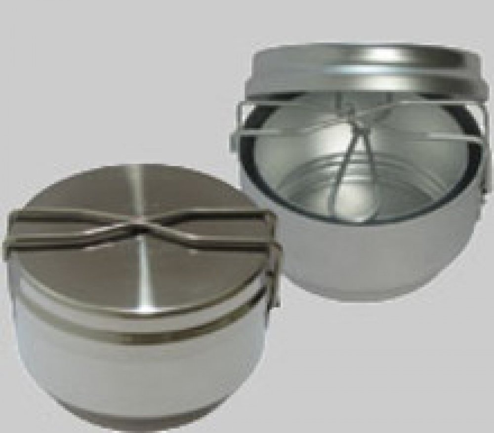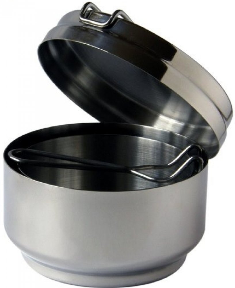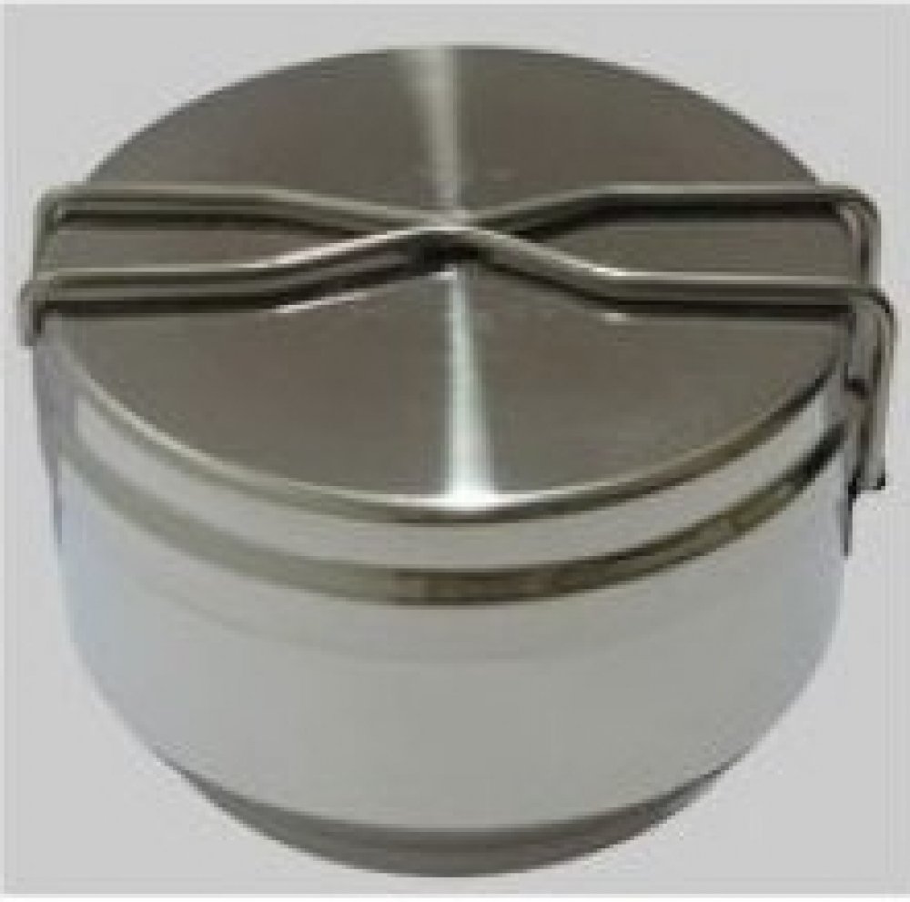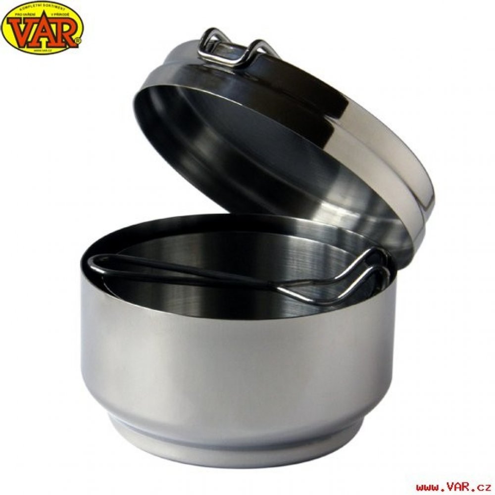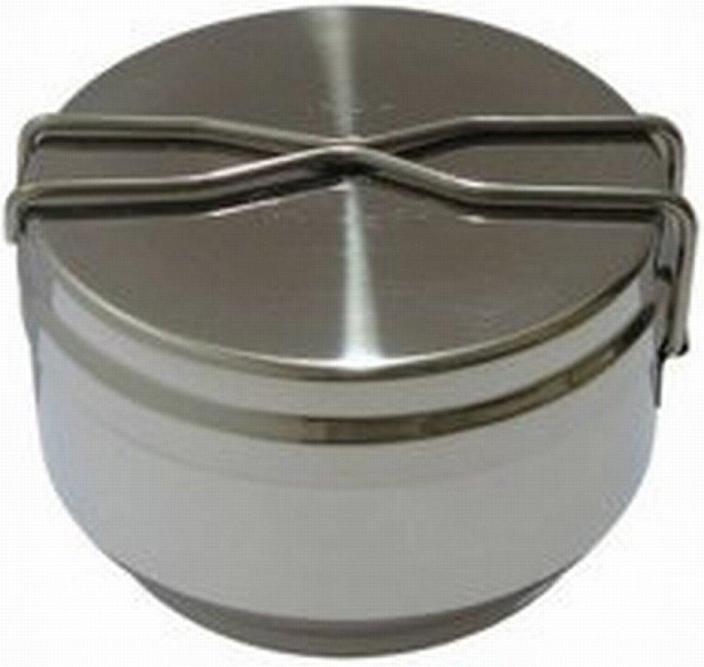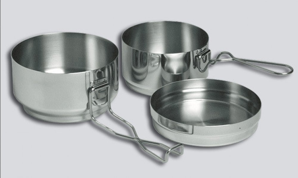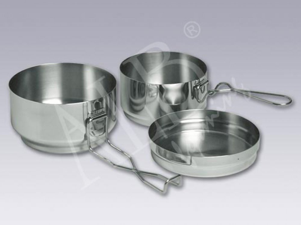 Klasický nerezový ešus - 1 větší nádoba s poklicí + 1 menší nádoba bez poklice. Obě nádoby mají sklopné rukojeti. Poklice se může použít též jako malá pánev.