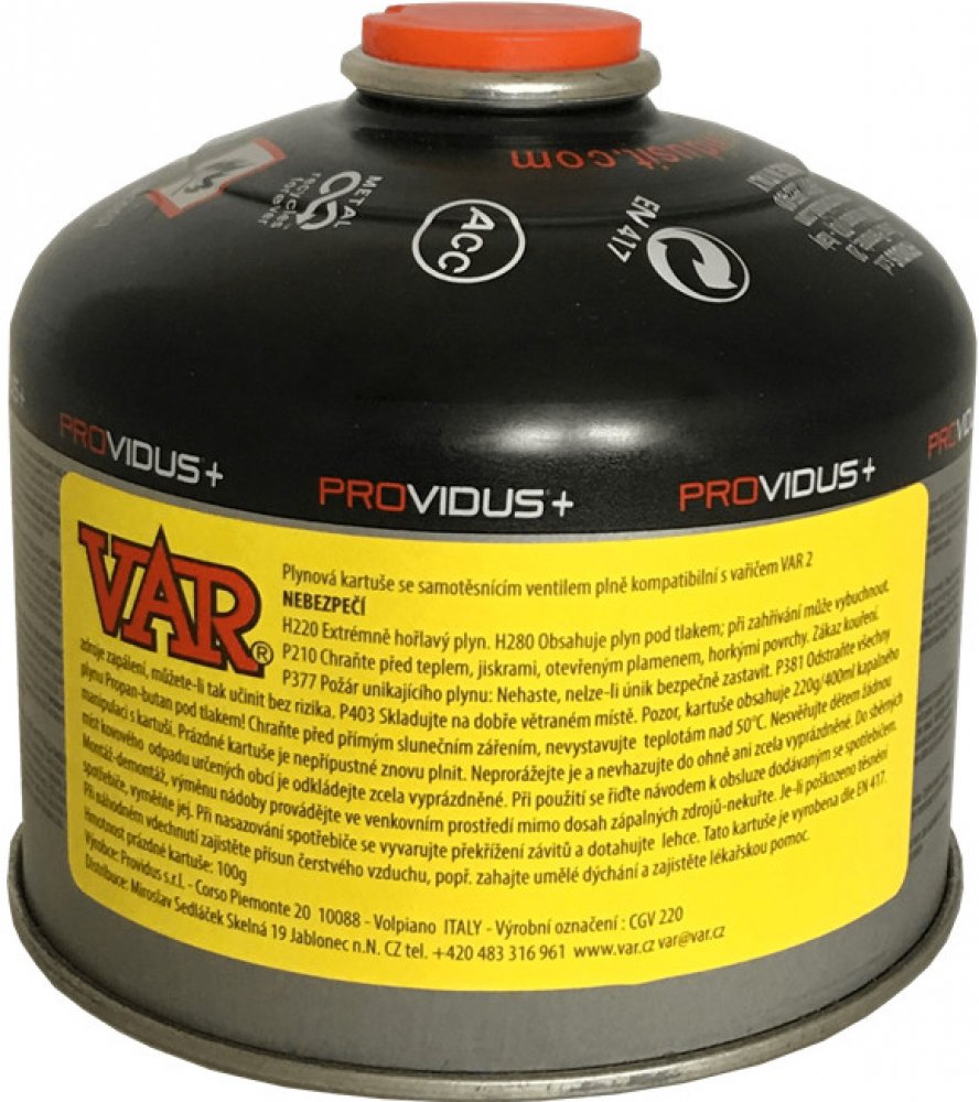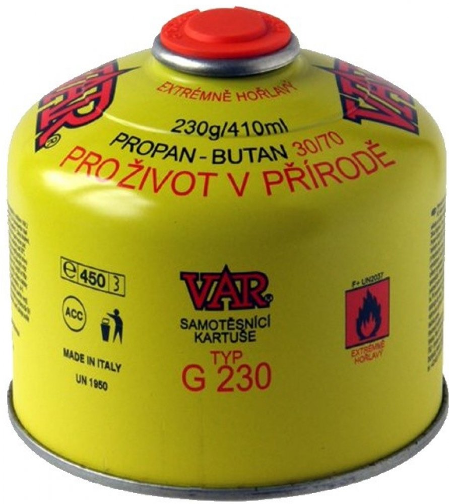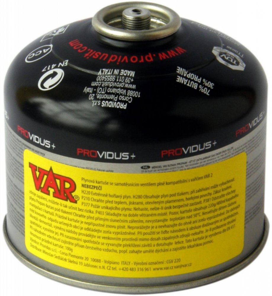 VAR G 220 je plynová kartuše z tenkého ocelového plechu se zvýšenou odolností a dovoluje tak náplň směsí 30:70 propan-butan. Tato směs vytváří dostatečný tlak i při teplotách pod bodem mrazu. Svým tvarem, velikostí a hlavně použitou směsí umožňuje provoz vařiče i v náročných podmínkách.