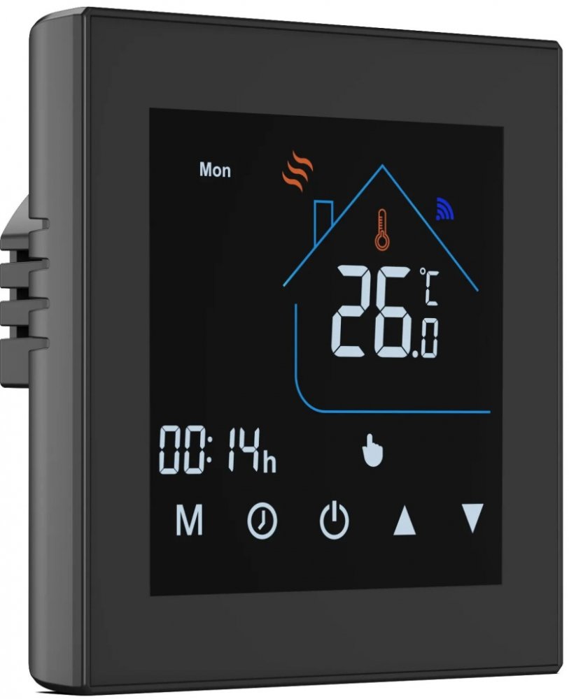 Technické parametryNapětí:95–240 V AC, 50/60 HzMax. zátěž:5 A (beznapěťový kontakt, GC)Senzory:Integrovaný + možnost připojit NTC 10kPřesnost:±0,5 °CNastavitelná teplota:5–35 °CDisplejová teplota:5–99 °CProvozní teplota:0–45 °CSpotřeba:< 1,5 WOvládání:Kapacitní dotyková tlačítkaMateriál:PC + ABS (nehořlavé)Ochrana:IP20Rozměry:86 × 86 × 43 mmObsah balení