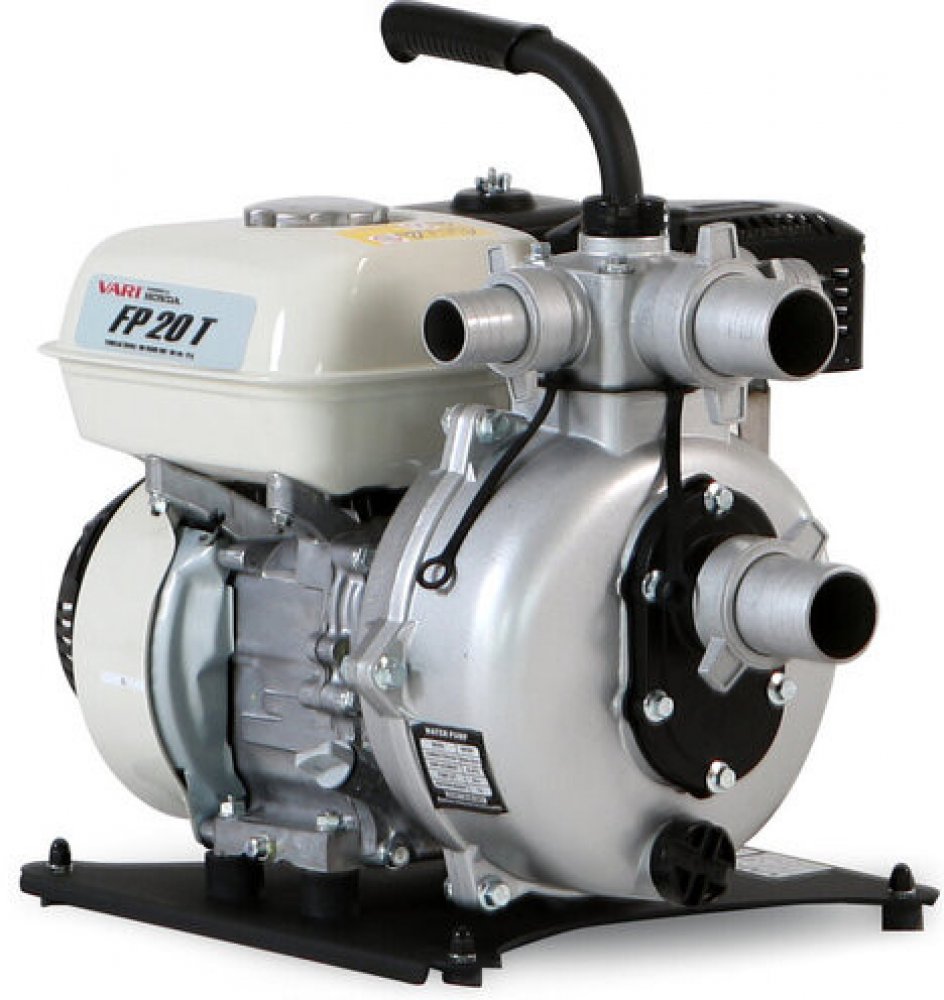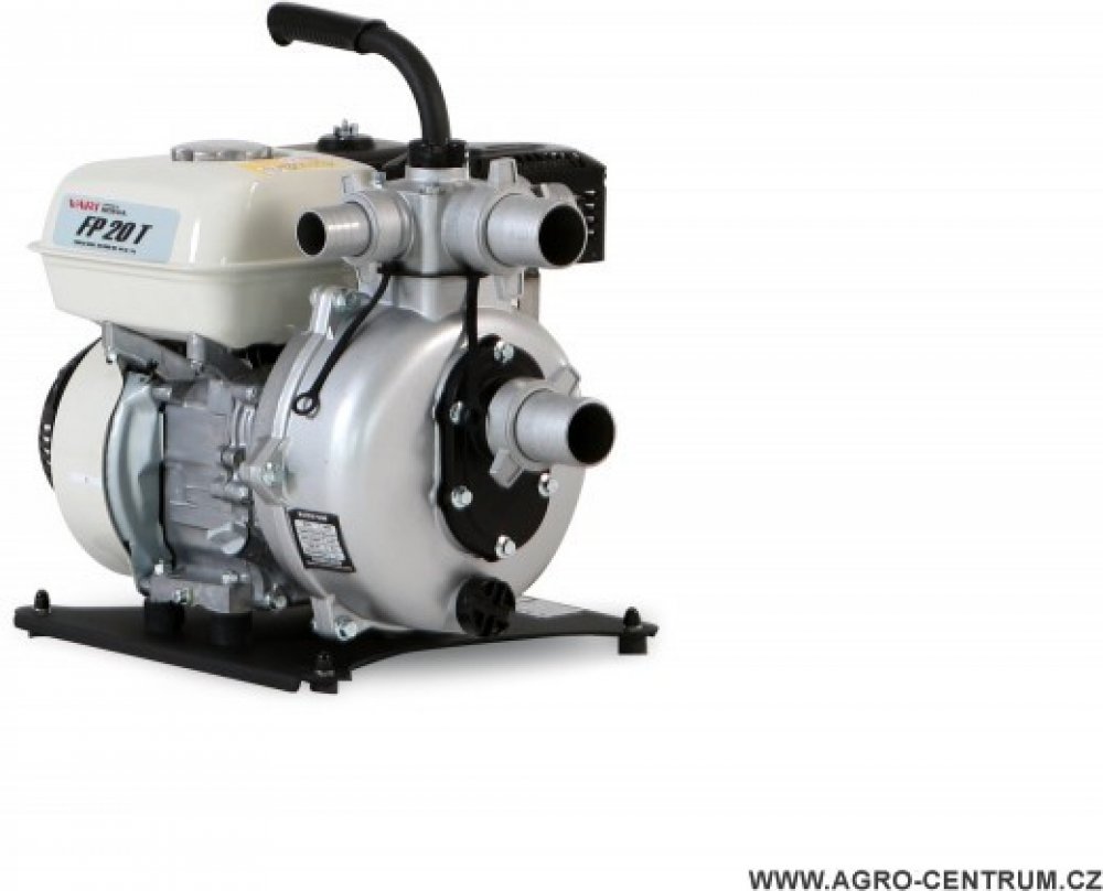 Vysokotlaké čerpadlo VARI FP20T je vhodné k čerpání čisté a mírně znečištěné vody. Je osazeno motorem HONDA GP 200. Při průtoku vody 500 l/min. snadno odčerpáte vodu z bazénu nebo dešťovou vodu ze sudu či jiného zásobníku za účelem zavlažování zahrady. Motorové vysokotlaké vodní čerpadlo FP20 slouží pro rychlé přečerpání vody s vysokým tlakem vody na výstupu z čerpadla nebo pokud potřebujete dopravit vodu na místa s větším terénním převýšením. Motor - HONDA GP 200 Objem palivové nádrže - 3,1 l Max. průtok - 500 l/min. Max. výtlak - 65 m Hmotnost - 24,8 kg