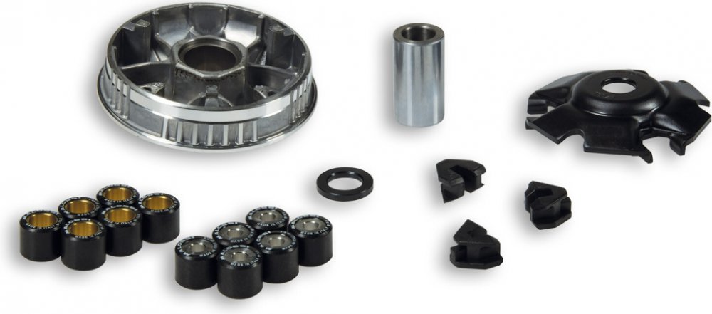V sadě je variátor a dvě sady válečků 20x17 mm o hmotnostech 9,5 g a 13,5 g. Sada neobsahuje kontrastní pružinu. Výrobce doporučuje válečky 9,5 g pro 125-150cc a 13,5 g pro 200cc. Tento variátor je určen pro hřídel s průměrem 17 mm a je kompatibilní i s čínskými motory GY6 125cc (152QMI) při stejném průměru hřídele.