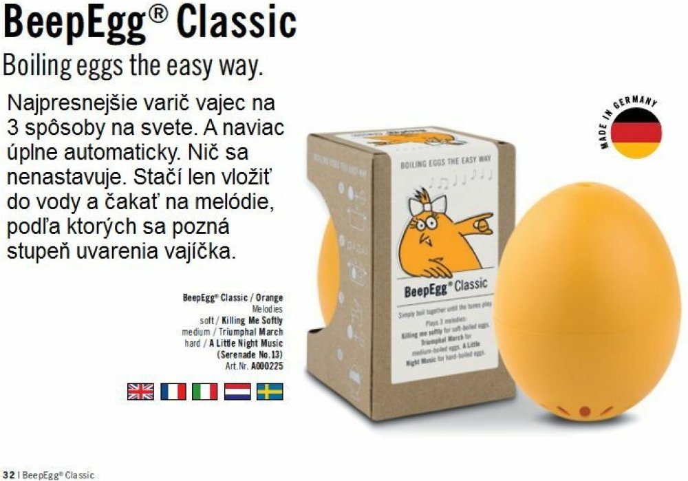 První hudební časovač na vaření vajec, který opravdu funguje. Postupně třemi melodiemi oznámí stupeň uvaření žloutku. Vyrobeno v Německu.