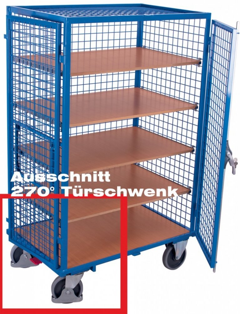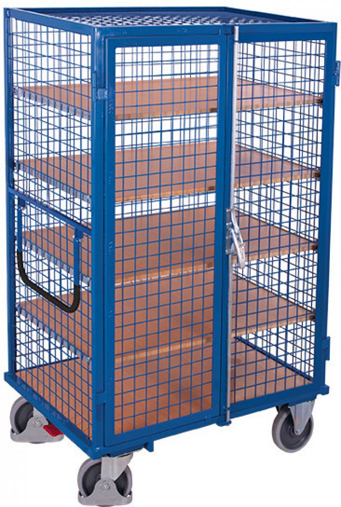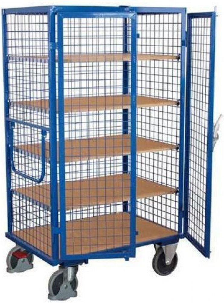 Vysoké policové vozíky s 5 policemi jsou vhodné pro bezpečnou přepravu a uskladnění zboží.- Vozík lze uzamknout pákovým zámkem.- Police jsou vyrobené z MDF desky, čtyři z nich jsou odnímatelné a přestavitelné v rastru 10 cm.- Vozíky jsou opatřené mřížovými bočnicemi s oky velikosti 5 x 5 cm.- povrchová úprava práškovým lakem.- 4 nešpinivá kola z termoplastické pryže s kuličkovými ložisky, dvě pevn...