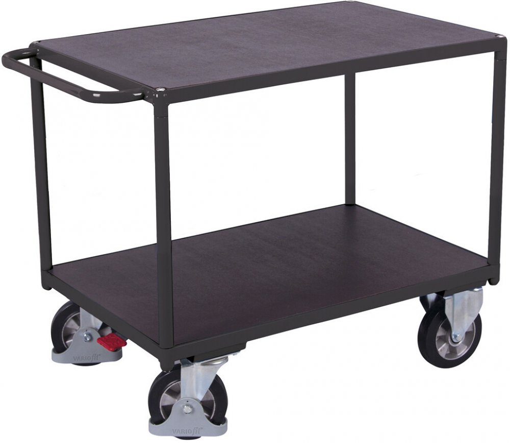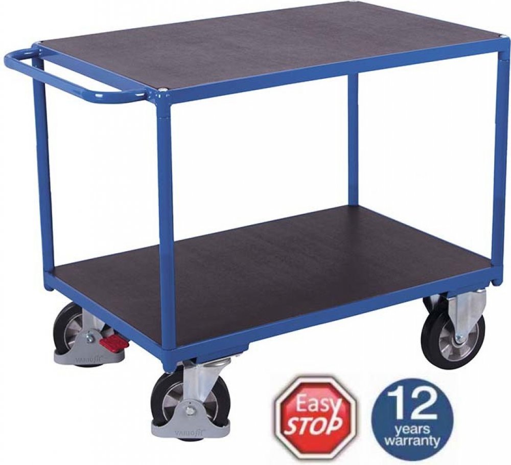 Policové vozíky se dvěma policemi vhodné do skladů pro přepravu zboží a materiálu.- Police jsou vyrobené z MDF desek pokrytých pozinkovaným plechem.- povrchová úprava práškovým lakem.- 4 nešpinivá kola z termoplastické pryže s kuličkovými ložisky, dvě pevná a dvě otočná s brzdou Easy Stop a ochrannými kryty.- TÜV SÜD ISO 9001 certifikace