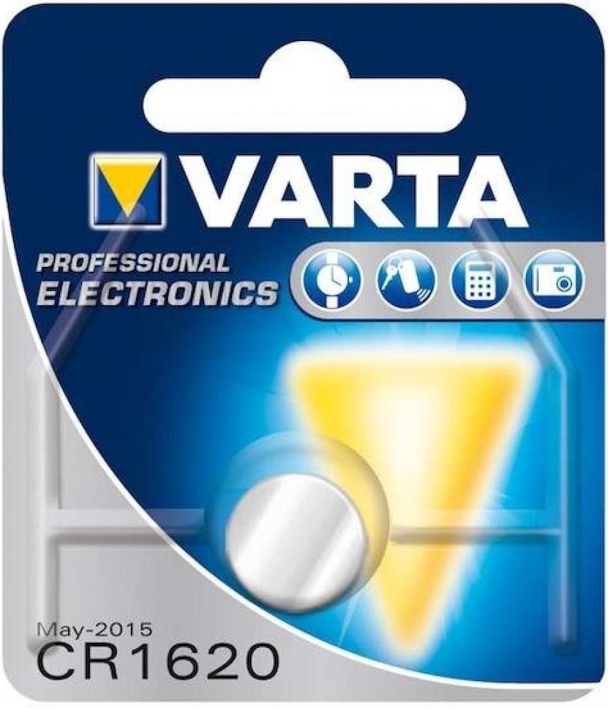 Varta 1x 3V CR 1620. Typ baterie: Baterie na jedno použití, Typ baterie: Lithium, Napětí baterie: 3 V. Výška: 2 mm, Průměr: 1,6 cm, Hmotnost: 1,2 g. Šířka balení: 56 mm, Hloubka balení: 7,5 mm, Výška balení: 65 mm. Formát baterie: Knoflík