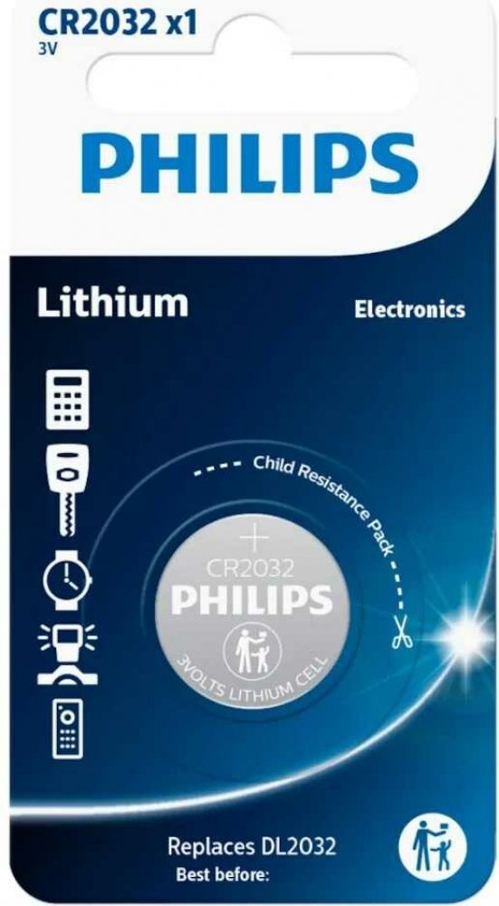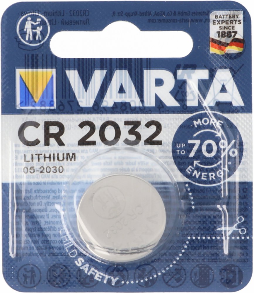 Lithiová knoflíková baterie CR2032 odpovídá mezinárodní normě IEC CR2032. S napětím 3V a kapacitou 230 mAh zajistí dlouhodobý výkon. Průměr činí 20 mm při výšce 3,2 mm a hmotnosti 3 g. Elektrochemický systém založený na primárních lithiových článcích minimalizuje samovybíjení.