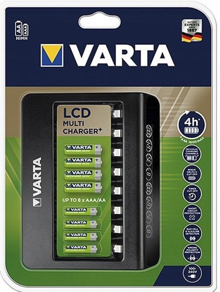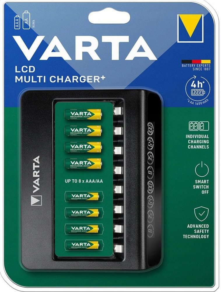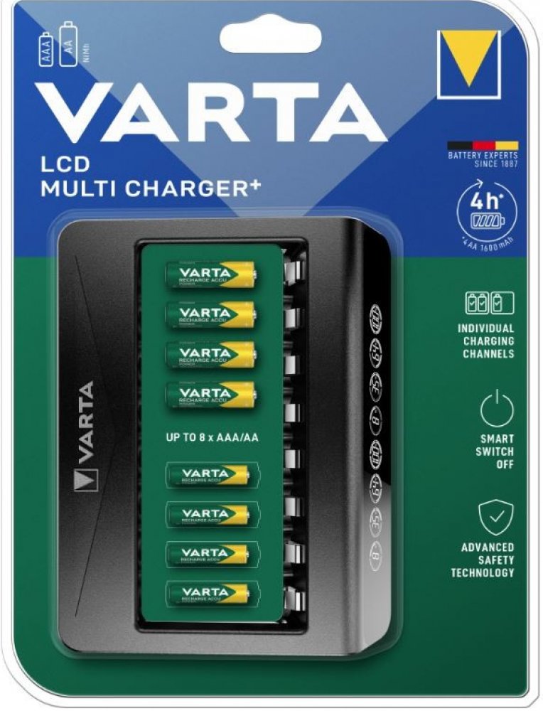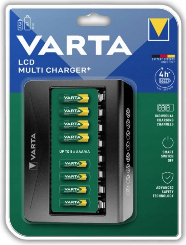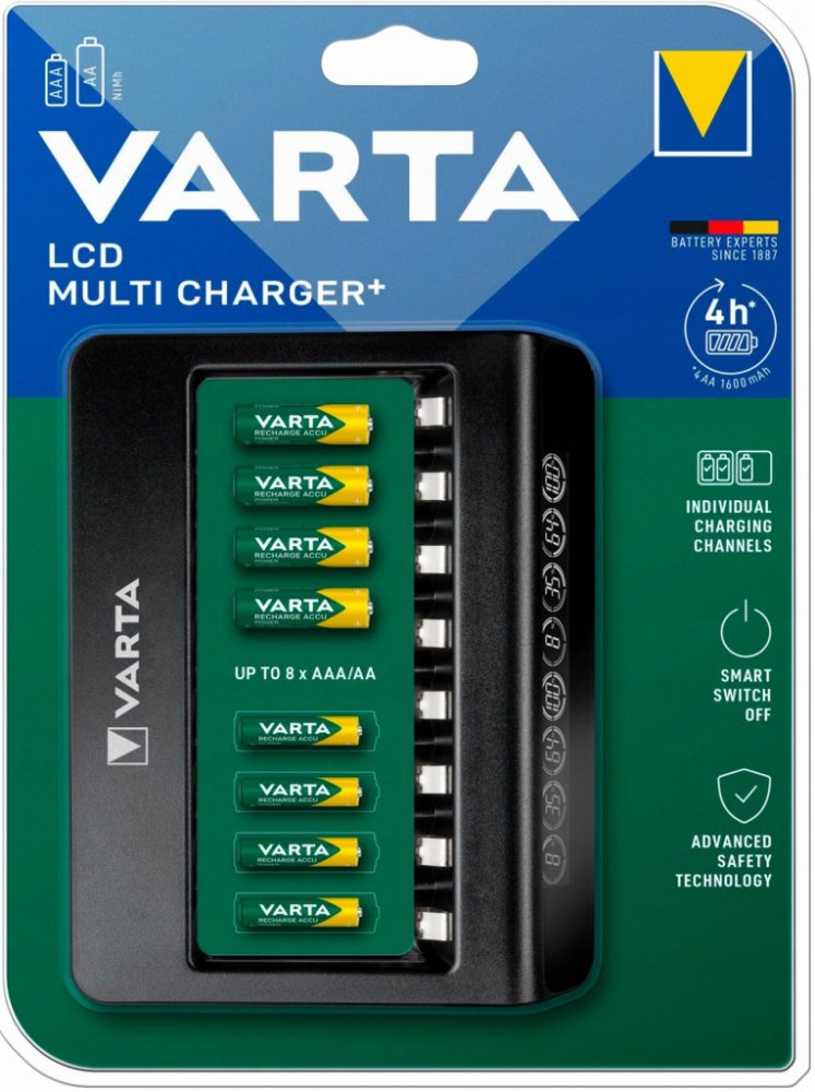VARTA LCD MULTI CHARGER+ je vícekanálový procesor pro oblíbené Ni-MH články o velikosti AA / R6 a AAA / R03. Má 8 nezávislých kanálů umožňujících nabíjení 1 až 8 baterií různých velikostí a kapacit v libovolných konfiguracích. Vyhrazený AC adaptér (100-240V) součástí balení.