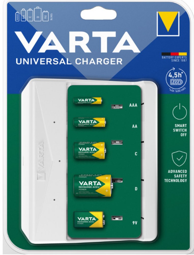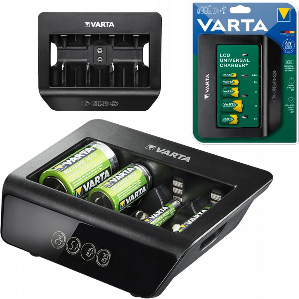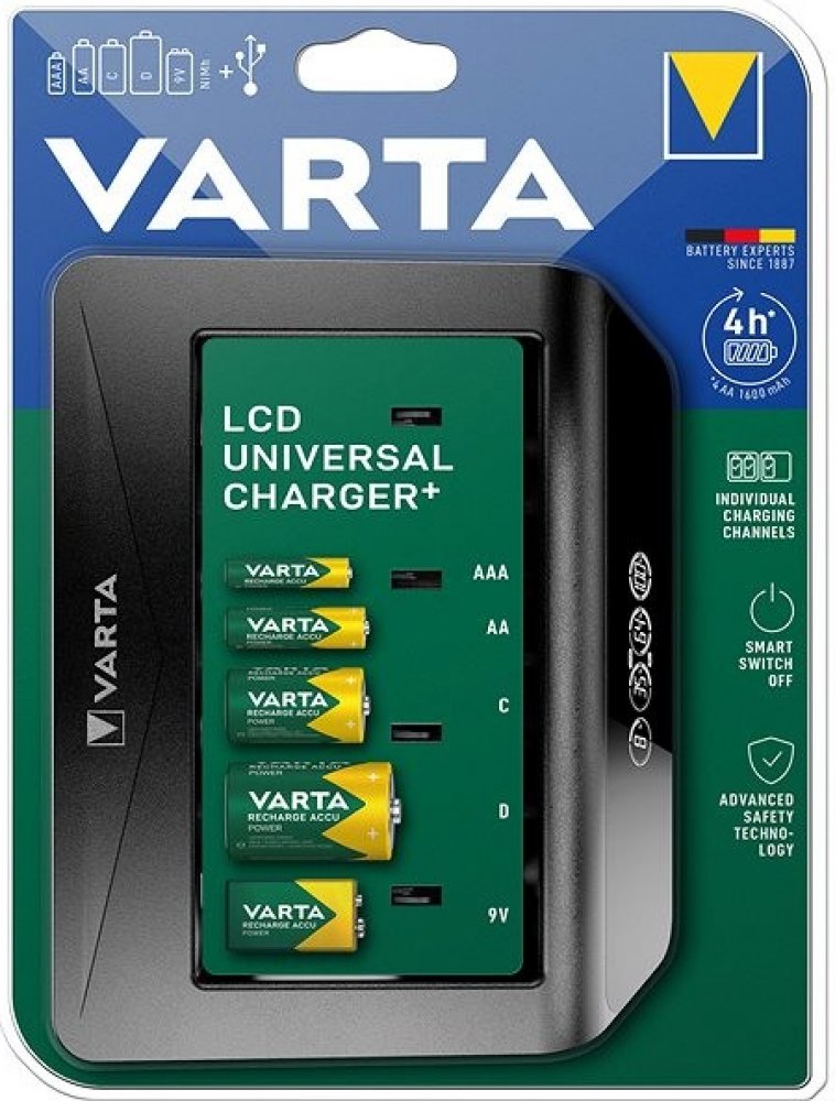 Nabíjí až 4AA, AAA, C, D nebo 1 x 9V baterie