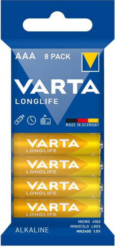 Baterie VARTA LONGLIFE Micro AAAMicro AAA LR 03Přehledná komunikace oblastí použití pomocí piktogramů VARTA LONGLIFE jsou baterie s nejdelší výdrží. Obzvláště dobře fungují v zařízeních s konstantní a nízkou energetickou náročností, např. Například dálkové ovladače, nástěnné hodiny nebo rádia. Baterie LONGLIFE se vyznačuje dlouhou dobou chodu a spolehlivým dodáním energie.