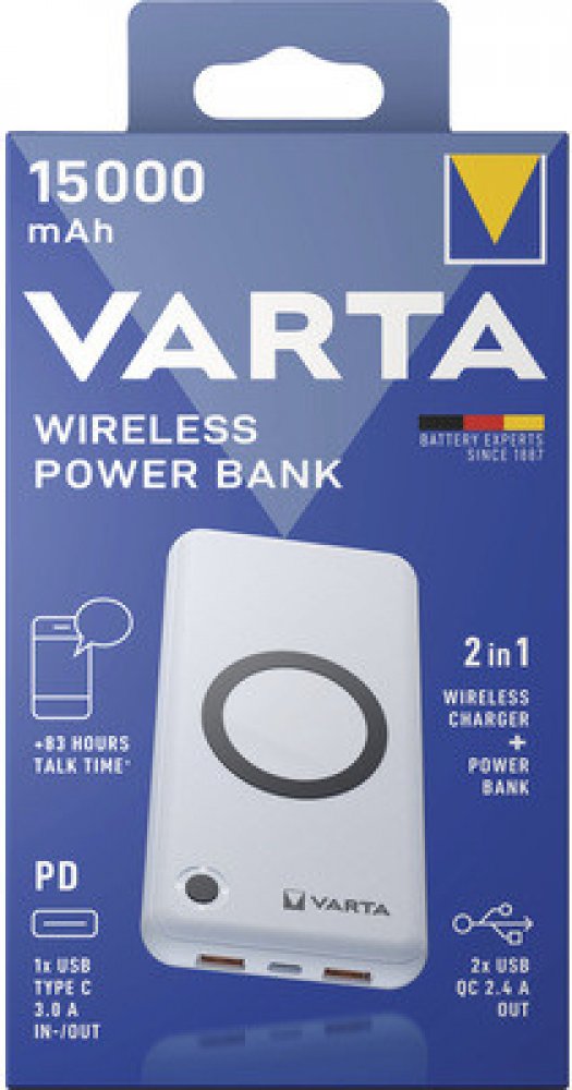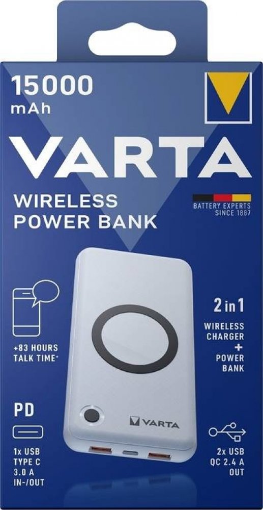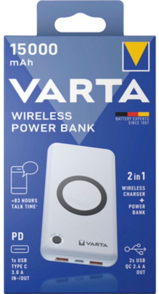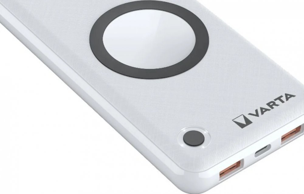 Varta powerbanka s kapacitou 15000mAh a možností bezdrátového nabíjení.