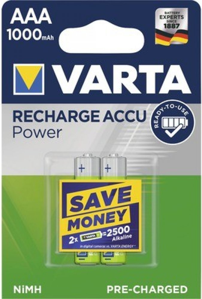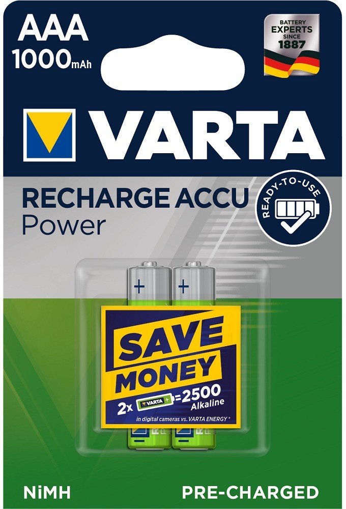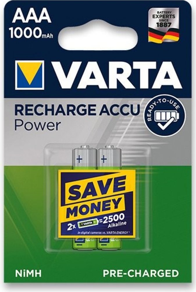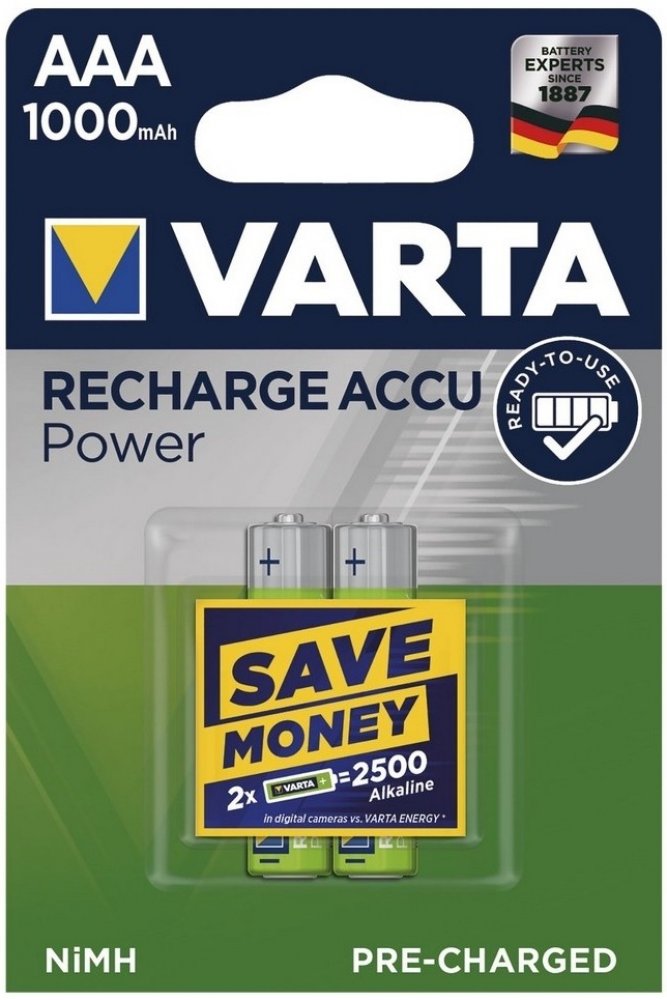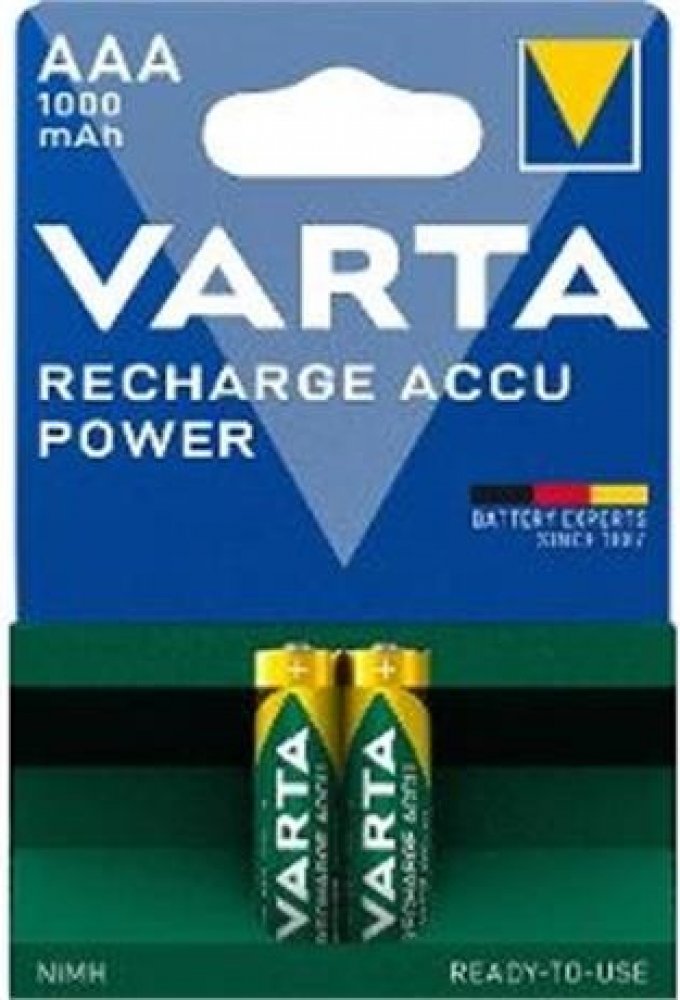 Nabíjecí Ni-MH baterie AAA s kapacitou 1000 mAh. VARTA Recharge Accu Power je výkonná produktová řada, která dodává přesné množství energie pro všechny standardní a chytré aplikace každodenního použití. Technologie ""Ready To Use"" znamená, že jsou baterie připraveny k okamžitému použití bez nutnosti prvotního nabíjení. Napětí 1,2 V. Micro. HR03, 2 ks v balení.