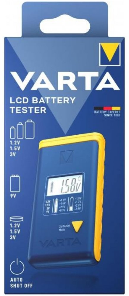 * Testuje velikosti baterií: AA, AAA, C, D, 9V, speciální válcovité a knoflíkové baterie