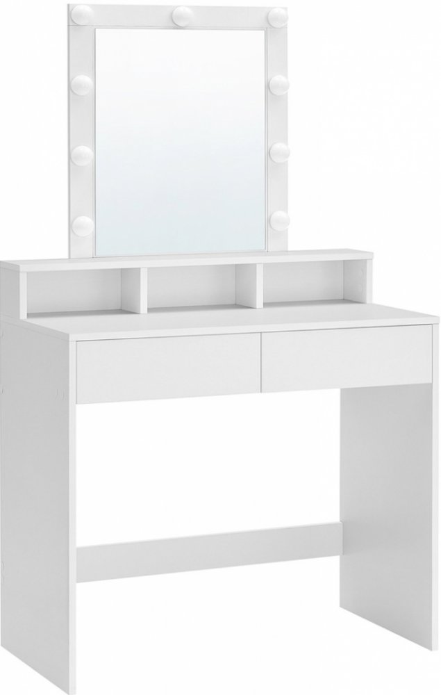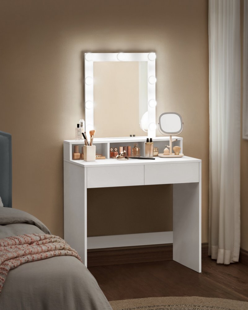 Oživte svůj zkrášlovací rituál s naším toaletním stolkem Vanesa, který má navíc na zrcadle 9 žárovek s nastavitelnou úrovní svícení, takže Váš make-up bude perfektní! Všechno na svém místě: Často hledáte své kosmetické doplňky, štětce, laky na nehty a ostatní make-up pomůcky? Díky dvěma prostorným zásuvkám a třem otevřeným přihrádkám bude mít každá rtěnka, parfém či pudřenka své místo. Moderní design a okouzlující vzhled Vám vykouzlí úsměv na tváři každé ráno, když se k němu posadíte. Sbohem zašpiněné povrchy od dekorativní kosmetiky! Tento stolek je vyroben ze snadno čistitelných melaminových panelů, takže jeho údržba je opravdu jednoduchá.Doporučeno: Z bezpečnostních důvodů upevněte stolek na zeď pomocí dodaného příslušenství, které je k tomuto určeno. Zabráníte tak jeho případnému převrácení.Technické specifikace:barva: bílámateriál: dřevotříska, melaminová dýharozměry: 80 x 40 x 145 cm (D x Š x V)hmotnost: 24,5 kgPřipojení pomocí adaptéru do zásuvkyVýhody produktu:elegantní designjednoduchá údržbadvě prostorné zásuvkyvčetně osvětlení na zrcadle (připojuje se do zásuvky)Obsah zásilky:1 x kosmetický stolek9 x žárovka (+1 náhradní žárovka)1 x montážní sada1 x sada proti převrácení1 x návod k použití nastavitelný jas]9 žárovek (dlouhým stisknutím spínače nastavíte světla) splňuje různé požadavky na jas pro dokonalé líčení[Dostatek prostoru] 1 vyvýšená polička na parfémy, 3 otevřené přihrádky na rtěnky, 2 prostorné zásuvky na fény a žehličky na vlasy a velká police. Tento toaletní stolek nabízí dostatek prostoru pro přehledné uložení všech vašich věcí[Skryté dráty žárovek] Dráty žárovek jsou skryté za zrcadlem a nejsou vidět na povrchu, aby vytvořily krásnější prostředí[Protikus pro větší bezpečnost] Kosmetický stolek připevněte ke stěně pomocí přiloženého protikusu, abyste dosáhli maximální bezpečnosti[Robustní a snadno čistitelný] Tento toaletní stolek je vyroben z kvalitní dřevotřísky a je robustní a odolný; jeho povrch je odolný proti opotřebení a snadno se čistí, což umožňuje dlouhodobé používáníPodrobnosti o výrobku: Vnitřní prostor je vybaven speciální deskou na odkládání prádla, která je součástí balení:- Barva: bílá- Materiál: dřevotříska- Rozměry: 40 x 80 x 145 cm (D x Š x V)- Hmotnost: 23,5 kgRozsah dodávky:- součástí dodávky je 1 x toaletní stolek- 1 x balení příslušenství- 1 x ochrana proti překlopení- 1 x návod k použitíPoznámky VASAGLE:- Z bezpečnostních důvodů nesmí děti na výrobek lézt ani si s ním hrát.- Připevněte výrobek ke stěně pomocí dodaného příslušenství proti překlopení. Šatní stolek Fritz, bílý Šatní stolek se zrcadlem a žárovkami, 2 zásuvky a 3 otevřené přihrádky, bílý Nastavitelný jas: 9 žárovek (dlouhým stisknutím spínače nastavíte intenzitu světla) splňuje různé potřeby jasu pro vaši kosmetickou rutinu - při zapojení do zásuvky se používá dodaný adaptér. Dostatek úložného prostoru: oční stíny a pudr jsou nyní ve dvou velkých zásuvkách, lak na nehty je dobře chráněn ve 3 otevřených přihrádkách - vše má své místo. Ušetříte spoustu času i místa. Jednoduchý vzhled: Elegantní bílá barva, čisté linie a minimalistický design vytvářejí jednoduchý, ale výrazný kosmetický stolek, který lze snadno začlenit do vaší ložnice. Praktické zrcadlo: Zrcadlo je dostatečně velké a je vybaveno 9 žárovkami. Umožňuje vám zblízka si prohlédnout vaše líčení ze všech úhlů. Sestavení je hračka! Nebojte se konstrukce tohoto toaletního stolku. Díky jasnému návodu a označeným jednotlivým dílům je montáž tohoto toaletního stolku rychlá a snadná. Materiál - sklo Barva - bílá Rozměry - 80 x 40 x 145 cm Šířka - 80 cm Hloubka - 40 cm Výška - 145 cm Počet kusů v balení - 1 VŠECHNY UŽ JSOU TADY:Už vás nebaví každý den shánět kosmetiku? Minulost. Oční stíny a pudry jsou již ve 2 velkých zásuvkách, laky na nehty jsou dobře chráněny ve 3 otevřených přihrádkách a parfémy vystavené na vyvýšené plošině.SKVĚLE NASTARTUJÍ DEN!Moderní design, obdélníkové zrcadlo a zářivý vzhled vám vykouzlí úsměv na tváři, jakmile se posadíte před tento kosmetický stolek; příprava zde vás pokaždé přiměje k tomu, abyste se znovu objevili!SBOHEM SKVRNY!Pudry na oční stíny, rozlitý podkladový krém... při nanášení make-upu se snadno ušpiníte. Ale nebojte se! Tento stolek na líčení je vyroben ze snadno čistitelných melaminových desek, abyste měli vždy zářivý prostor pro krásu.JE MONTÁŽ SLOŽITÁ?Ne! Pro usnadnění montáže jsme očíslovali jednotlivé díly a přiložili náhradní šrouby (pro jistotu). Postupujte podle jasných pokynů a tento toaletní stolek bude připraven k použití ve vaší ložnici!CO VÁM DÁME:Toaletní stolek se 2 zásuvkami, 3 otevřenými přihrádkami a velkým zrcadlem, ve kterém se můžete každý den obdivovat. Připevněte jej na stěnu pomocí přiloženého příslušenství proti překlopení a začněte s novou a elegantní kosmetickou rutinou.Osvětlení zrcadla je součástí balení. Technické parametry toaletního stolku: šířka: 80 cm hloubka: 40 cm výška: 145 cm