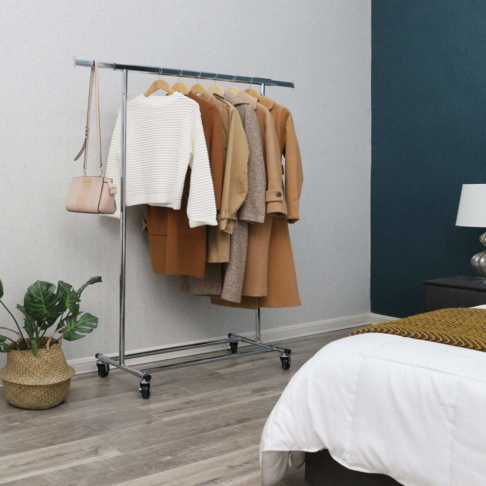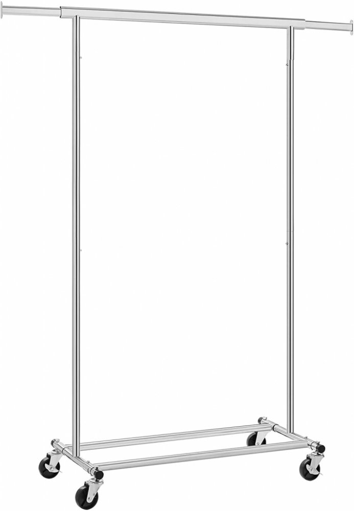 Díky dvěma spodním prutům poskytuje tento oděvní stojan úložný prostor pro vaše krabice na uskladnění, což ho činí víceúčelovým pro použití nejen v ložnici nebo předsíni, ale i v prádelně pro sušení oblečení. Ocelový chromovaný povrch též umožňuje venkovní použití.