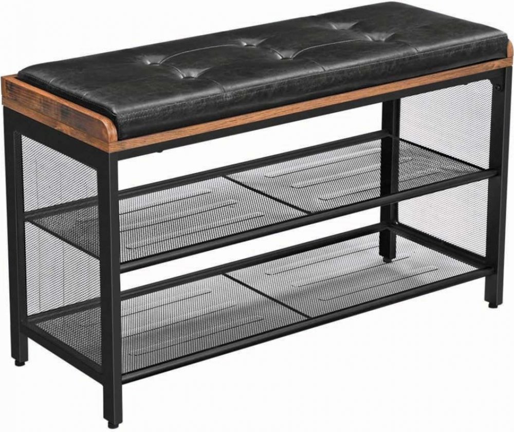 Lesklá černá syntetická kůže, 2 police s úzkým okem na boty a vintage povrchem v robustním dřevěném vzhledu. Tento botník nabízí mnoho možností!Pohodlný odnímatelný polštář vám zpříjemní každodenní rutinu. Stabilní kovová konstrukce 80 x 30 x 48 cm s nosností až 90 kg.Botník s nastavitelnými nožičkami vydrží i na nerovných podlahách. Kromě toho je podlaha chráněna před poškrábáním.