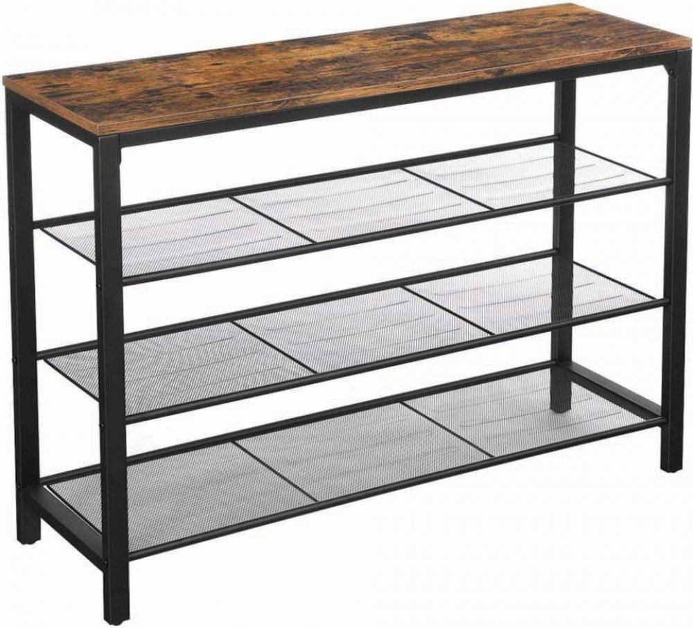 Matně černý kovový rám a vintage hnědý povrch tohoto botníku spolu perfektně ladí.Každá polička botníku pojme až 5 kg. Na horní poličku můžete uložit květináče, kabelky nebo cokoliv budete potřebovat. Nastavitelné nožičky zajistí bezpečnost a stabilitu.