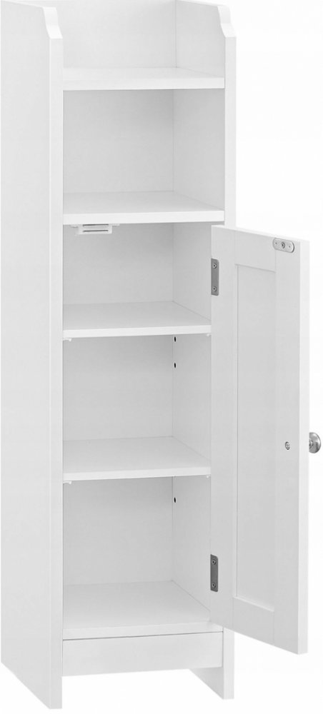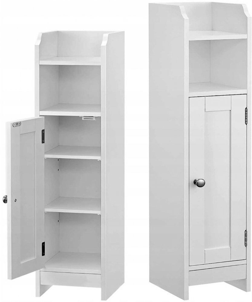 Bílá úzká koupelnová skříňka, která může stát samostatně, nebo ve skupině s ostatními.