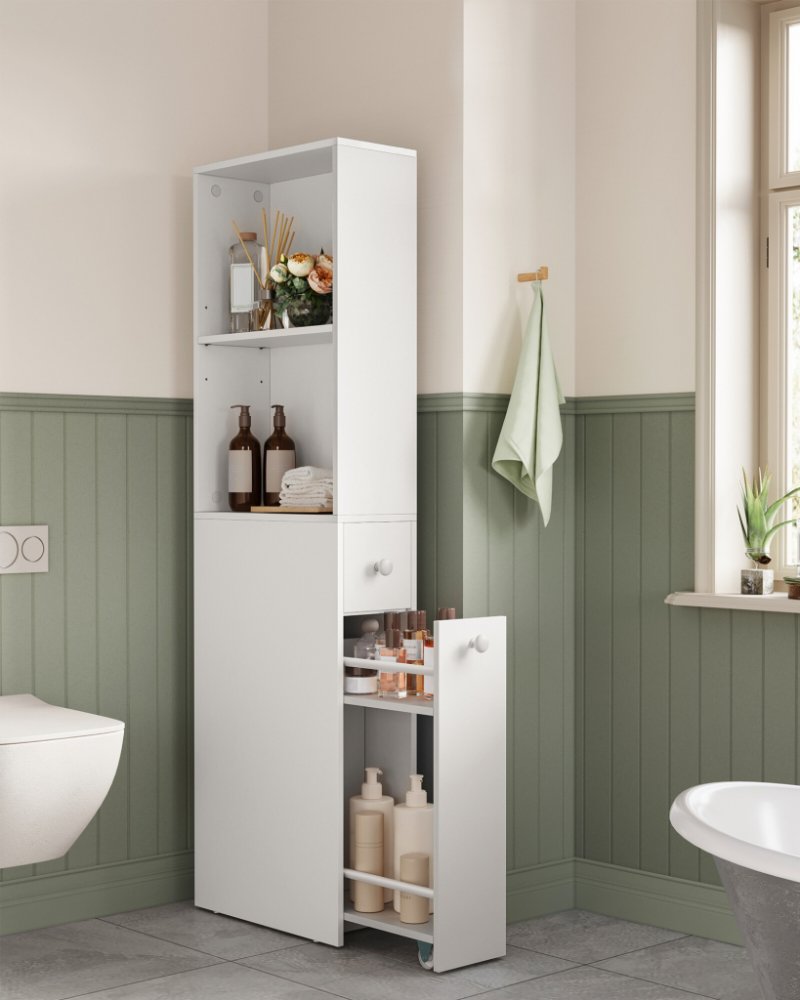 [Ideální pro malé kouty] Maximalizujte úložný prostor ve své domácnosti s touto úzkou koupelnovou skříňkou (40 x 18 x 134,4 cm). Skvěle se hodí do malých rohů vaší koupelny, např. mezi stěnu a toaletu[Koupelnováskříňka má nastavitelnou polici, která rozděluje horní část na 2 otevřené přihrádky, malou zásuvku a velkou zásuvku ve spodní části. Udržujte své nádobí přehledně uspořádané[2 možnosti montáže]Horní část koupelnové skříňky lze namontovat tak, aby směřovala doleva nebo doprava, což umožňuje flexibilní přizpůsobení prostoru bez ohledu na to, na kterou stranu je otočena vaše toaleta[Robustní a stabilní] Úzká koupelnová skříňka je vyrobena z vysoce kvalitní MDF, je robustní a stabilní a poskytuje pevnou oporu pro vaše předměty. Dodávaná ochrana proti překlopení poskytuje dodatečnou stabilitu[Snadná montáž]Sestavení této vysoké skříňky je díky označeným dílům a jasnému návodu hračkou. Na úklid koupelny tak nemusíte dlouho čekatPodrobnosti o výrobku: Koupelna je vybavena speciálními dveřmi, které jsou součástí balení:- Barva: klasická bílá- Materiál: MDF (dřevovláknitá deska střední hustoty)- Rozměry: 40 x 18 x 134,4 cm (D x Š x V)- Hmotnost: 15,5 kgRozsah dodávky:- koupelnová skříňka: 1 x- 1 x balení příslušenství- 1 x ochrana proti překlopení- 1 x návod k použitíPoznámky VASAGLE:- Pro bezpečné používání připevněte tuto koupelnovou skříňku ke stěně pomocí přiložené ochrany proti převrácení.- Z bezpečnostních důvodů není dovoleno, aby děti na koupelnovou poličku lezly nebo si s ní hrály.- Neumisťujte koupelnovou skříňku na delší dobu do vlhkého prostředí, aby nedošlo k prasklinám a deformaci.