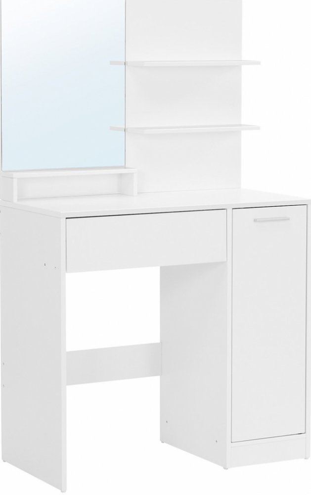 Chcete mít dobou náladu hned od rána? Pak tu pro Vás máme skvělý recept: Sedněte si před toaletní stolek Ester, naličte se a usmějte se na sebe do zrcadla. To je návod jak začít nový den tím správným způsobem! Vše pěkně uspořádané a přehledné: Rtěnky a laky na nehty uložte na poličky, nebo do přihrádky na stole, make-up a štětce do zásuvky a všechny větší lahvičky, odličovací prostředky a vlasové stylingové pomůcky do skříňky napravo. Proveďte svou každodenní kosmetickou rutinu s uklizeným stolem! Díky dřevotřískové desce a hladkému povrchu je tento toaletní stolek připraven vám sloužit po celá léta a chránit veškerou vaši kosmetiku. Muži, překvapte svou drahou polovičku: Elegantní lesklý design, čistý bílý povrch se zrcadlem prezentují čistý, elegantní styl. Vaše milovaná si bude s chutí sedat před tento kosmetický stolek. Jednoduché sestavení: Zkrášlovací rutina je zábavná... Stejně jako sestavení tohoto kosmetického stolku! S očíslovanými díly a jasnými pokyny jej nainstalujete opravdu jednoduše. Doporučeno: Z bezpečnostních důvodů upevněte stolek na zeď pomocí dodaného příslušenství, které je k tomuto určeno. Zabráníte tak jeho případnému převrácení. Technické specifikace: Barva: Bílá Materiál: Dřevotříska Rozměry: 80 x 40 x 132 cm (D x Š x V) Hmotnost: 27,8 kg Výhody produktu: jednoduchá montáž snadná údržba elegantní design množství úložného prostoru Obsah zásilky: 1 x Toaletní stolek 1 x Zrcadlo 1 x Montážní sada 1 x Návod k použití