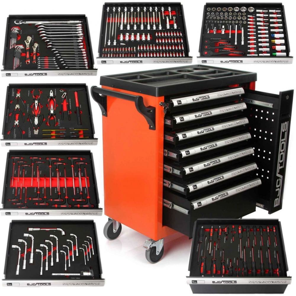 Popis : 6 zásuvek s náplněmi 1 velká zásuvka ideální pro velké nástroje a příslušenství Výsuvné zásuvky na vedeních s kuličkovými ložisky uzamčené klíčem Ocelová konstrukce práškové barvy 4 kola z nichž dvě jsou vybaveny zámkem Šířka Hloubka Výška Rozměry 770 mm kolečky 840 mm 460 mm 875 mm Rozměr 6 zásuvek 530 mm 390 mm 55 mm Rozměr 1 zásuvka 530 mm 390 mm 135 mm Rozměry pěnových vložek 520 mm 38...