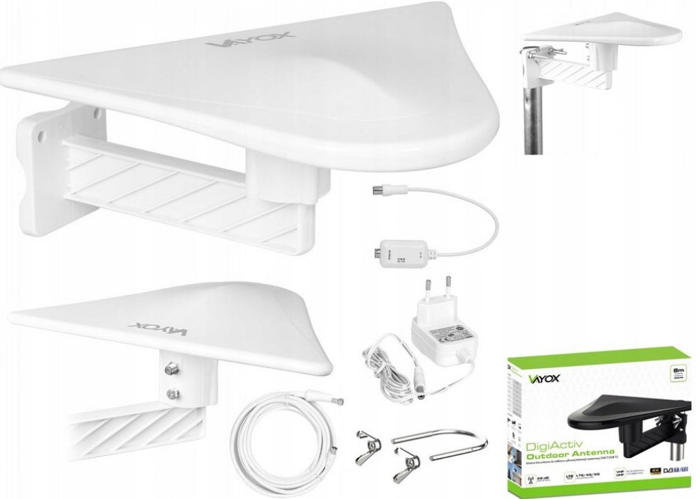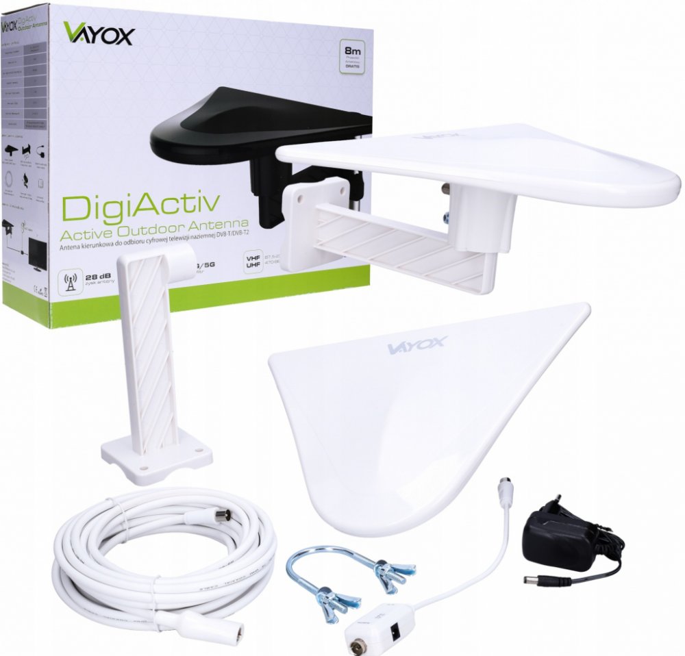 VAYOX DIGIACTIV 4G LTE VHF UHF DVB-T2 ANTÉNA VA0022Barva: bíláBalení: Kartonová krabičkaTyp: originálníJednotka: kusPočet kusů: 1Výrobce: VayoxHmotnost: 1020 gKód: T3fSN2kAaIVMYTYmWpFteXOcjKQlpJ9kIQPewwgZu6o= Vayayox je součástí dodávkyVAYOX DIGIACTIV ANTÉNA VA0022Vayox Digiactiv je venkovní směrová anténa pro příjem digitálního pozemního televizního vysílání. Řada antén Digiactiv se vyznačuje tím, že je určena pro použití v oblastech se středními příjmovými podmínkami. Poloměr vzdálenosti, ve které anténa Vayox Digiactiv VA0022 účinně přijímá signál z vysílací stanice, je přibližně 100 km v závislosti na síle signálu v dané oblasti. Anténa je určena především pro příjem digitálních pozemních televizních signálů, jako jsou DVB-T a DVB-T2 a MUX8 , v závislosti na výkonu vysílače. Způsob a kvalita konstrukce zajišťují rovnoměrné zesílení přijímaných signálů v celém frekvenčním rozsahu. Anténa Vayox digiactiv VA0022 je určena pro venkovní použití, což vyžaduje použití vhodných materiálů, které zajistí, že se anténa nijak nepoškodí. VA0022 je vhodná do širokého spektra povětrnostních podmínek, od vysokých teplot přes silný déšť, silný vítr až po sníh a s ním spojené teploty pod bodem mrazu. Precizní zpracování a použití nejlepších materiálů zajišťují nejvyšší kvalitu a dlouhou životnost.PODPOROVANÉ TECHNOLOGIE VAYOX DIGIACTIV VA0022DVB-T / DVB-T2 - jedná se o současný standard druhé generace digitální pozemní televize pro přenos komprimovaných multimediálních dat.MUX (mux1, mux2, mux3, mux8 ) - jedná se o nový systém pro současný přenos televizních a rozhlasových signálů, které jsou k přijímači přenášeny digitálně v jednom frekvenčním kanáluVHF / UHFLTE filtr - slouží k potlačení rušení ze sítí LTE, GSM a DectPřijímá signály FULL HD a 4kSADA OBSAHUJEAnténu Vayox Digiactiv VA0022Zesilovač integrovaný v anténěAnténní kabel 8 m s F-konektoremDržákNástěnný držáknapájecí jednotka antény 12 VAdaptér pro napájeníInstalační příručkaVLASTNOSTI VÝROBKUVysoce kvalitní zpracování a materiályVhodné pro použití v oblastech s průměrnými příjmovými podmínkamiPracovní rádius až 100 kmHlavní použití je příjem signálů DVB-T a DVB-T2Přijímá také VKV a UFH frekvence a multiplexyPřijímá kanály v rozlišení až 4kS vestavěným LTE filtremVestavěný anténní zesilovačZisk antény 28 dBÚroveň šumu nižší než 3 dBanténa otočnáo 360 stupňůRovnoměrné zesílení signálu v celém frekvenčním rozsahuOdolnost vůči nejnáročnějším povětrnostním podmínkám, od horka po sněhovou bouřiMimořádně snadná instalace bez použití nářadí