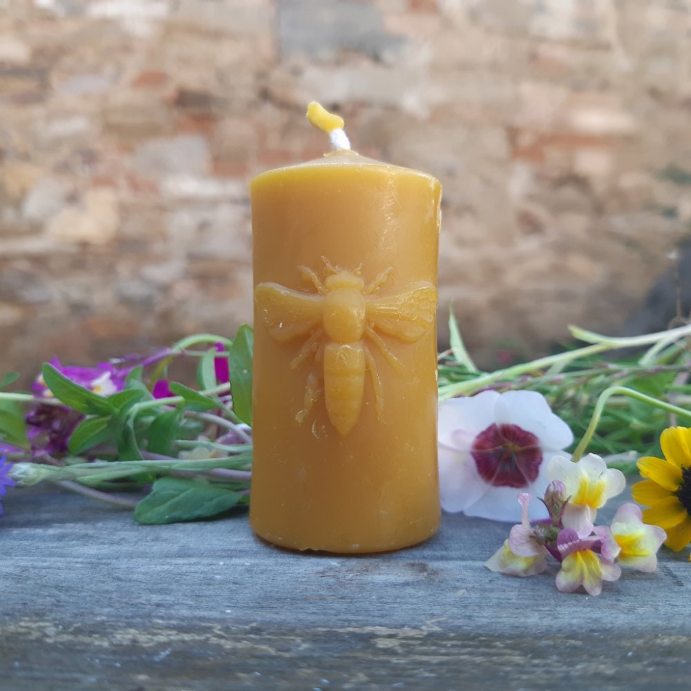 Válcovitá svíčka zblízka zaujme siluetou včely snadno provoní váš byt příjemnou medovou vůní. Skvěle se hodí na přírodní adventní věnce.