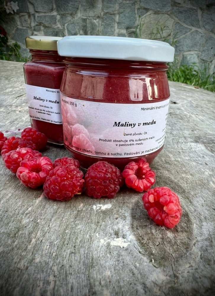 Maliny v medu jsou skvělou medovou pochoutkou, jsou mírně nakyslé, což jim dodáme tu správnou lahodnou chuť. Do pastového medu jste rozmíchali 4% lyofilizovaných lahodných malin.