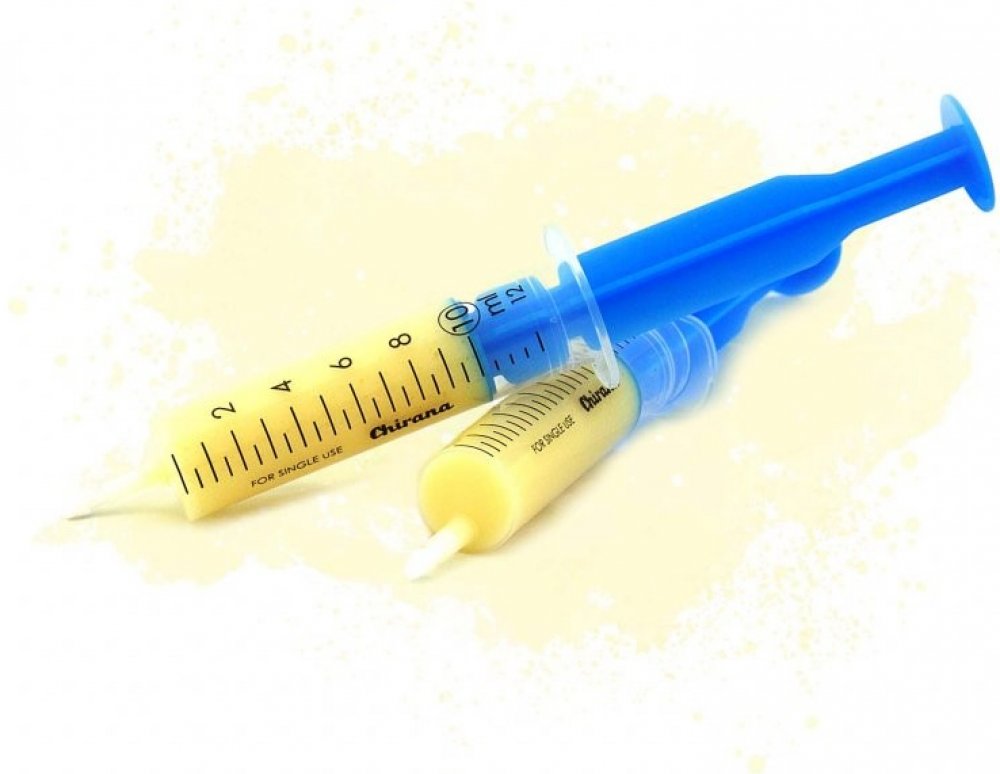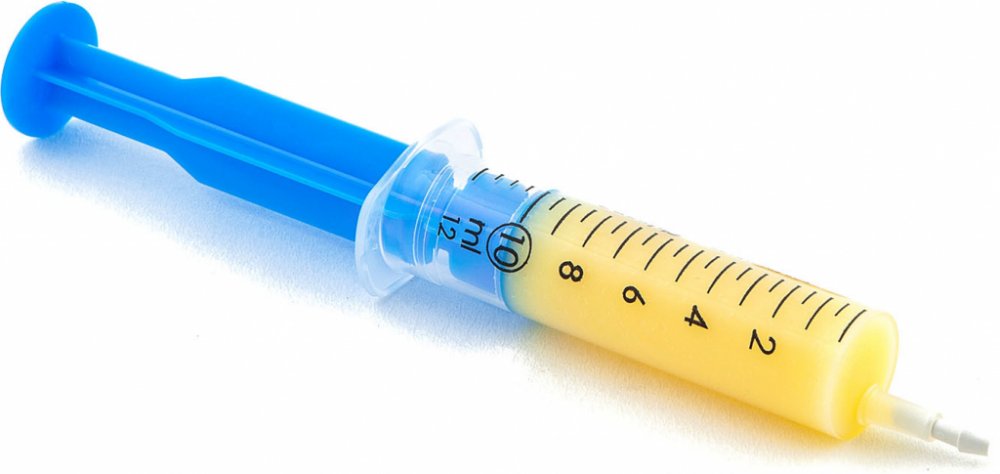 V plastové stříkačce, kde nejlépe vidíte, kolik gramů si dávkujete. (Plastové stříkačky jsou baleny v alobalu a spolu s letákem jsou vloženy do krabičky).