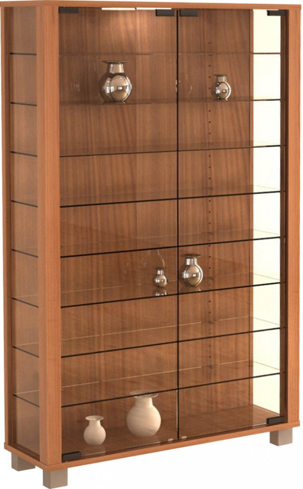 Elegantní vitrína LUMO Mini s dvířky, bočnicemi a 8 variabilními policemi z čirého tvrzeného bezpečnostního skla. Rám i stabilní zadní stěna jsou vyrobeny z kvalitní imitace dřeva.