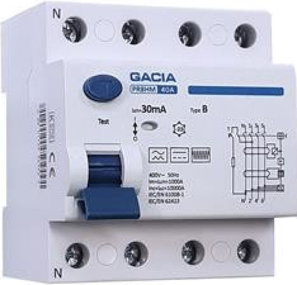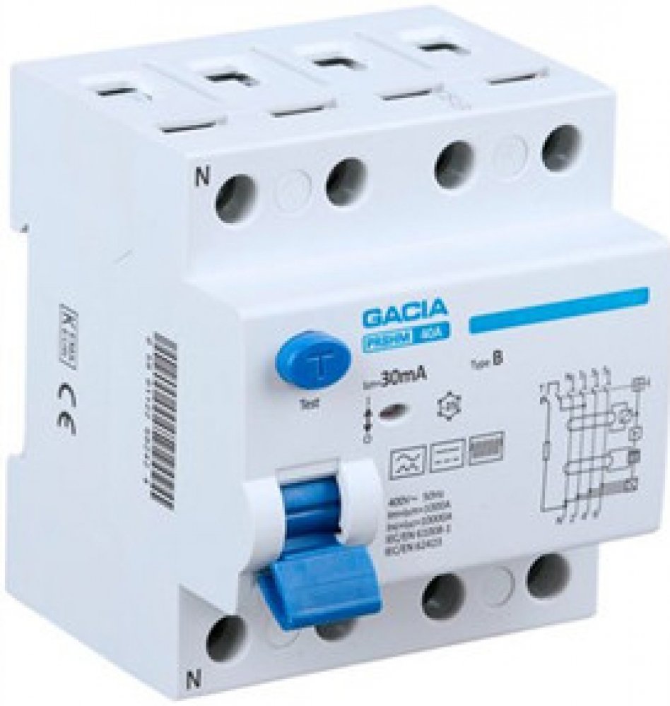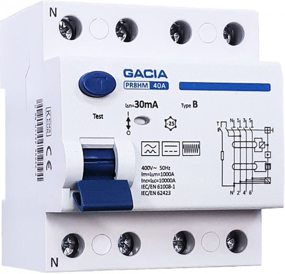 FVE Gacia proudový chránič PR8HM 4P, 40A, 30mA, typ B, na DIN lištu Proudový chránič PR8HM TYP B - vybaven tlačítkem TEST pro kontrolu správnosti vnitřního chodu zařízení - zkouška by měla být prováděna každých 30 dní. RCD 40A, 100mA, 4P, typ B TECHNICKÁ DATA: typ: B jmenovitý proud: 40A jmenovitý proud In: 30 mA Jmenovité impulzní výdržné napětí Uimp: 4,5kV Jmenovitá spínací a vypínací kapacita Im=IΔm: 1000A zkratová pevnost Inc=IΔc: 10kA stupeň znečištění: 2 jmenovité napětí EU: 400/415V elektrická životnost: 2000 mechanická životnost: 4000 ukazatel pracovní polohy: ano stupeň krytí: IP 20 skladovací teplota: -30/+70°C pracovní teplota: -30/+50°C maximální průřez připojovacích vodičů: 25 mm2 utahovací moment připojovacích svorek: 3Nm možnost připojení hřebenovými přípojnicemi: ano Technické údaje: Typ: B Jmenovitý proud 40A / 63A Jmenovitý proud. Vstup: 30mA Jmenovité impulzní napětí Uimp: 4,5kV Jmenovitá vypínací schopnost Im=IΔm: 1000A Zkratová pevnost Inc=IΔc: 10kA Stupeň znečištění: 2 Jmenovité napětí Ue: 400/415V Elektrická životnost: 2000 Mechanická životnost: 4000 Indikace provozní polohy: ano Stupeň krytí: IP 20 Skladovací teplota: -30/+70°C Provozní teplota: -30/+50°C Maximální průřez připojovacích vodičů: 25 mm2 Utahovací moment připojovací svorky: 3Nm Možnost připojení pomocí hřebenových lišt: ano