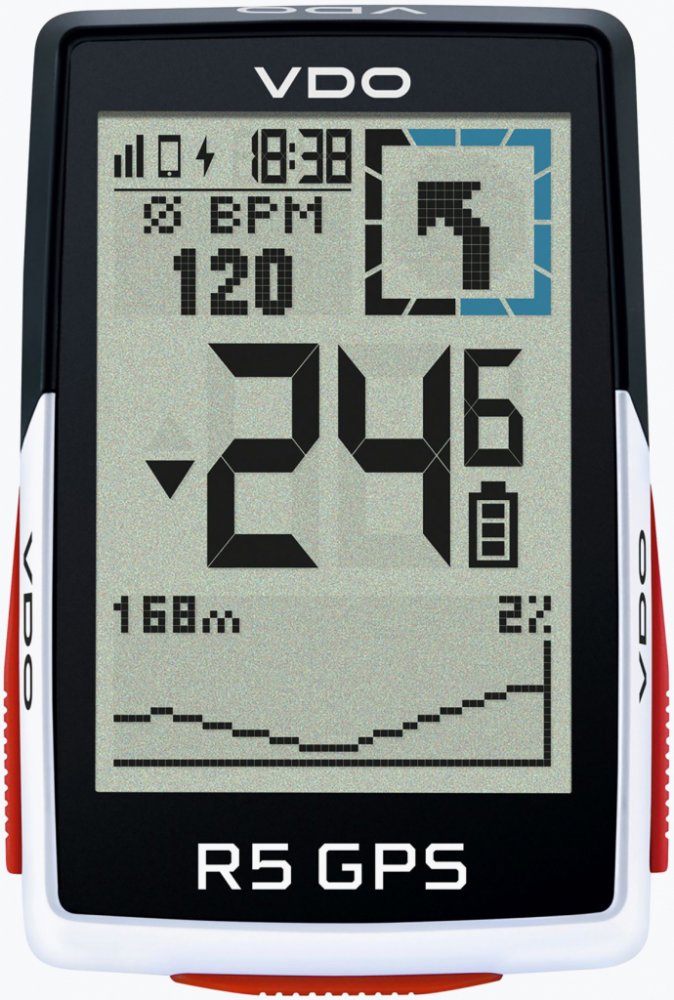 Vestavěný senzor tlaku vzduchu poskytuje spolehlivé informace o nadmořské výšce pomocí barometrického měření, určuje stoupání a klesání a umožňuje tak přesné zaznamenání trasy. VDO R5 umožňuje také grafické znázornění výškového profilu vaší trasy. Výchozí nadmořská výška na začátku jízdy je buď automaticky zkalibrována pomocí GPS nebo se může nastavit ručně.