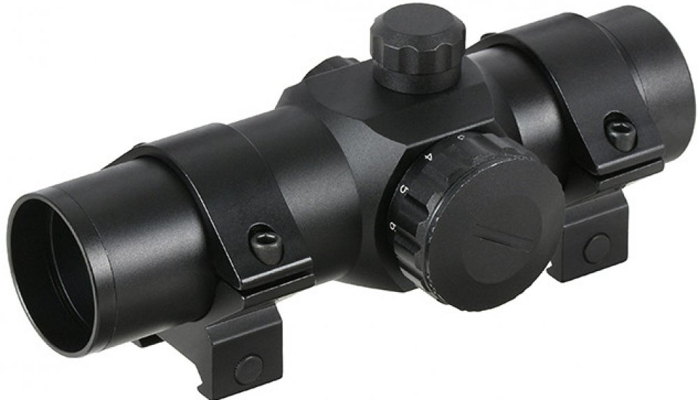 Balení obsahuje nízké montážní kroužky s uchycením na RIS lištu 22 mm, kolimátor, imbusový klíč.