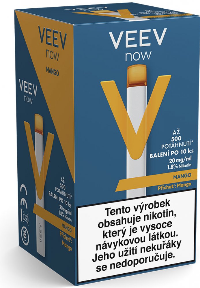 VEEV NOW MANGO je jednorázová elektronická cigareta s příchutí tropického manga. Tento produkt přináší svěží ovocnou chuť s aroma tropického manga. VEEV NOW je navržen jako prémiové zařízení v kapesní velikosti a stříbrné barvě. Bez tlačítek a s automatickým spuštěním potáhnutím je vždy připraveno k použití. Nemusíš se starat o žádnou údržbu - žádné čištění, nabíjení ani doplňování e-liquidu. S touto jednorázovou elektronickou cigaretou můžeš vychutnávat své oblíbené příchutě kdekoliv a kdykoliv. VEEV NOW nabízí až 500 potáhnutí s přednabitou baterií s ISO certifikací (280 mAh) a obsahuje 2 ml vysoce kvalitního e-liquidu s 1,8% obsahem nikotinu (20 mg/ml). Karton obsahuje 10 zařízení VEEV NOW. Po použití nezapomeň, že zařízení VEEV NOW nepatří do běžného odpadu - přines své zařízení a my zrecyklujeme jeho recyklovatelné komponenty. *Odhadovaný počet potáhnutí může být ovlivněn individuálním způsobem použití.