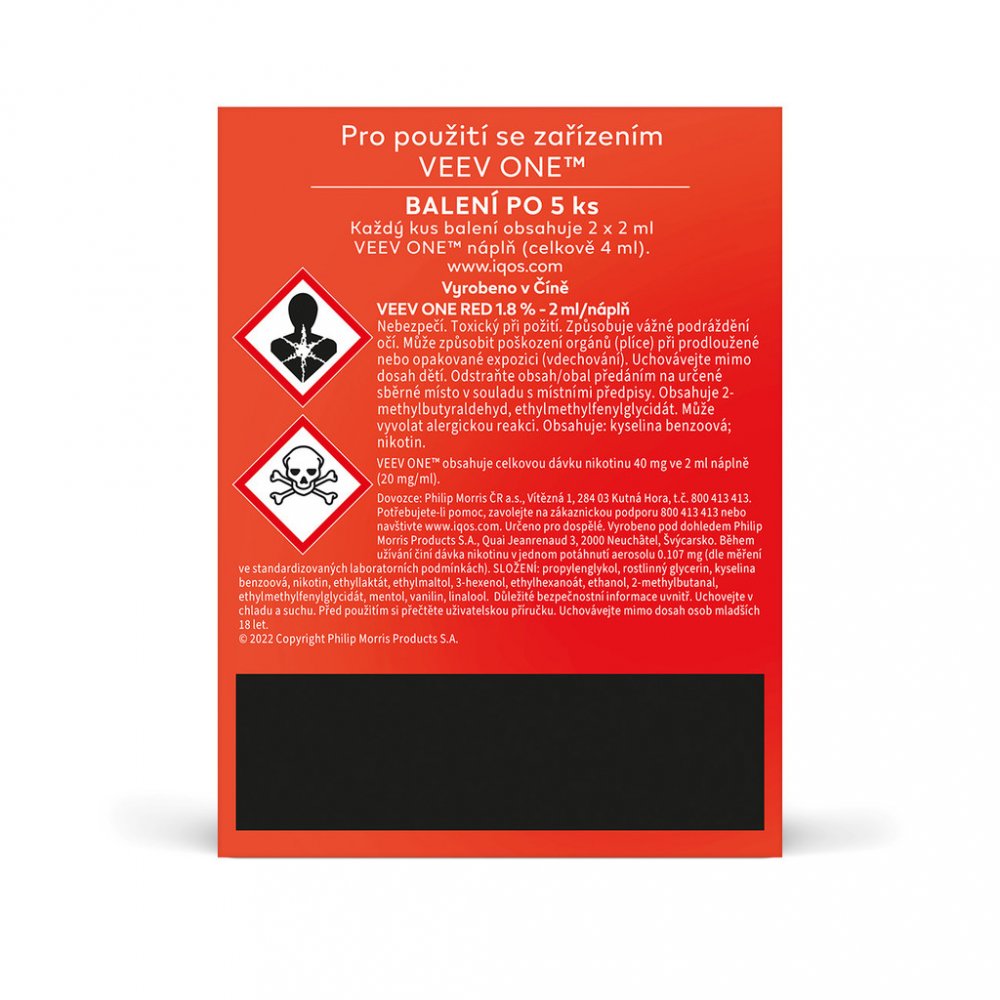 Náplně VEEV ONE RED s osvěžující ovocnou příchutí doplněné o aroma dračího ovoce a jahody nabízejí jedinečný zážitek díky kombinaci aromatických látek používaných v potravinářství a nikotinu ve farmaceutické kvalitě. Tyto náplně zaručují kvalitní chuťový požitek s každým potáhnutím a nevyžadují žádné čištění ani doplňování e-liquidu. Náplně VEEV ONE jsou určeny výhradně pro použití se zařízením VEEV ONE. Každý karton obsahuje 5 krabiček, přičemž každá krabička obsahuje 2 náplně s obsahem 2 ml e-liquidu. Obsah nikotinu je 20 mg/ml (1,8 %).