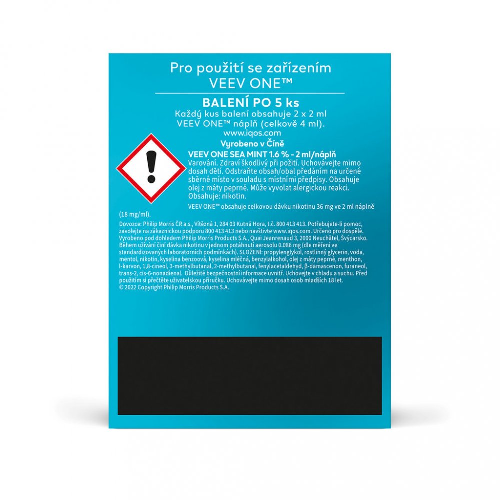 Náplně VEEV ONE SEA MINT s osvěžující mátovou příchutí doplněné o vyvážené krémové tóny nabízejí jedinečný zážitek díky kombinaci aromatických látek používaných v potravinářství a nikotinu ve farmaceutické kvalitě. Tyto náplně zaručují kvalitní chuťový požitek s každým potáhnutím a nevyžadují žádné čištění ani doplňování e-liquidu. Náplně VEEV ONE jsou určeny výhradně pro použití se zařízením VEEV ONE. Každý karton obsahuje 5 krabiček, přičemž každá krabička obsahuje 2 náplně s obsahem 2 ml e-liquidu. Obsah nikotinu je 18 mg/ml (1,6 %).