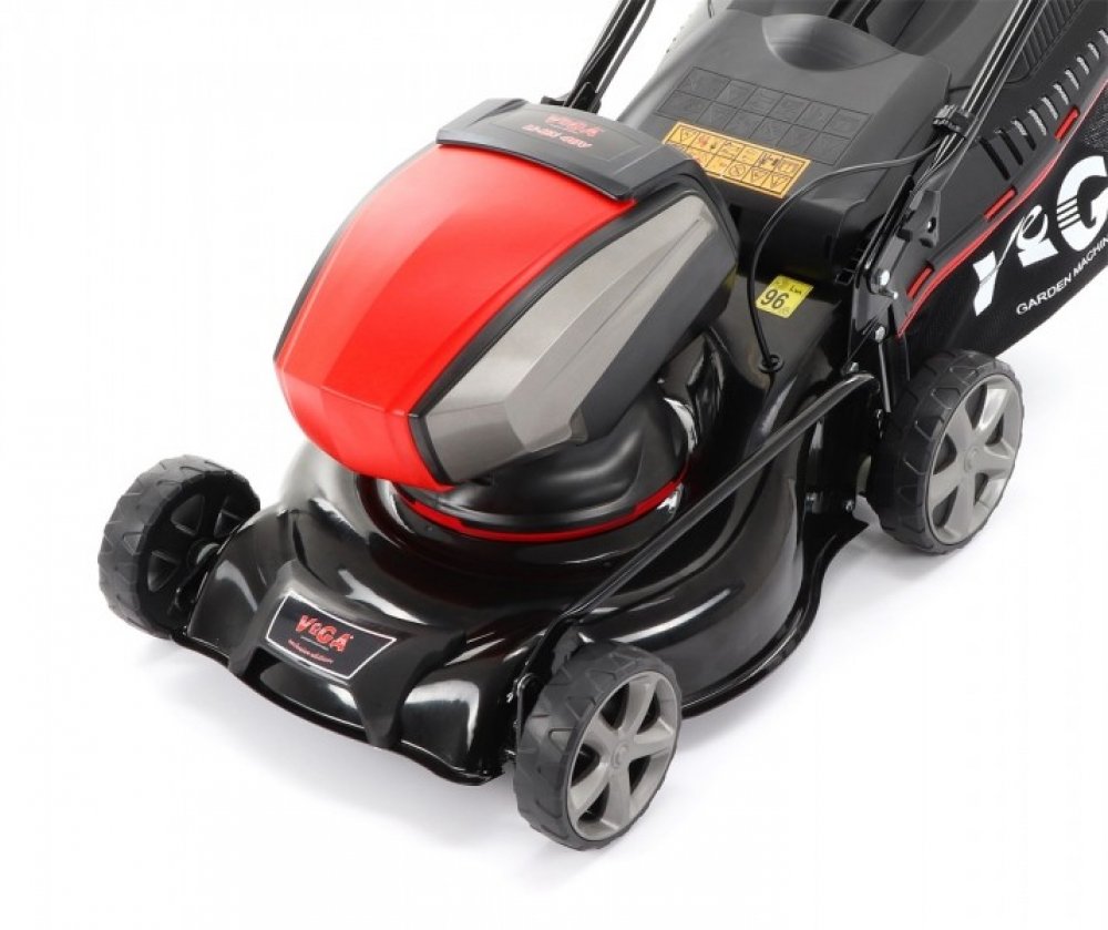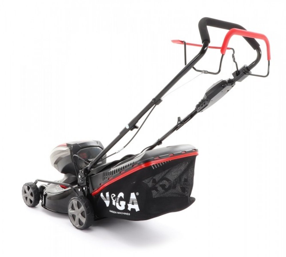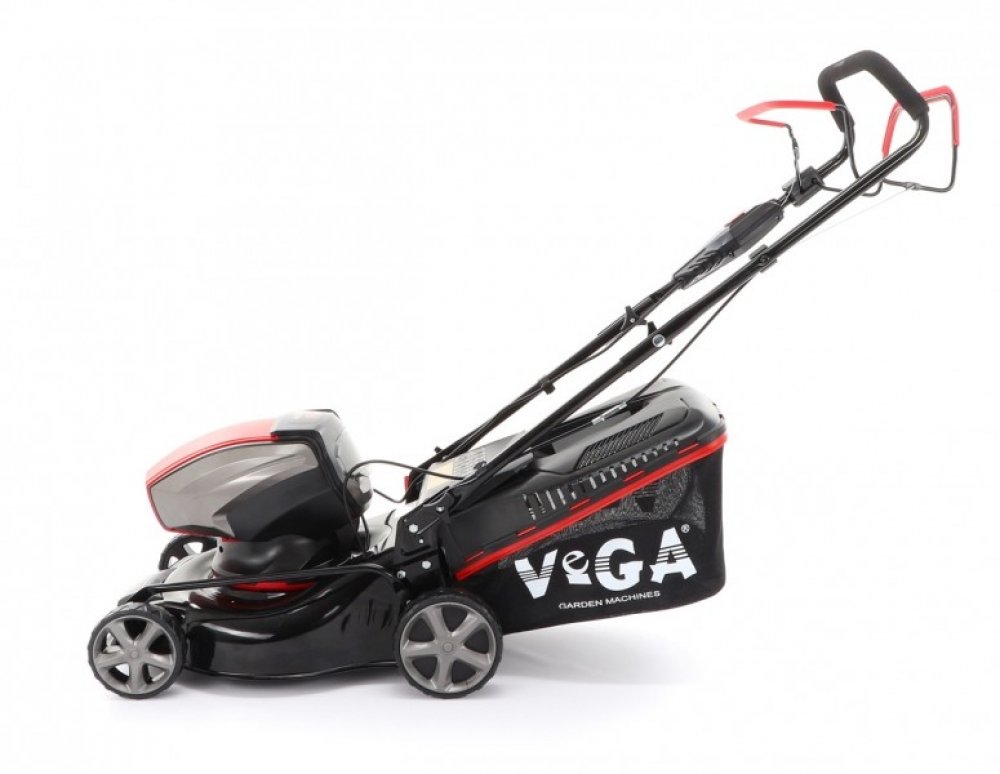 Velká zadní pojezdová kola i přední kola jsou uložena v oboustraných kuličkových ložiscích, centrální nastavení výšky sečení je u značky VeGA také samozřejmostí, jako ergonomické měkčené madlo. Objemný sběrný koš o kapacitě 60 litrů má ukazatel naplnění.
