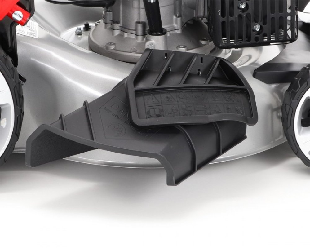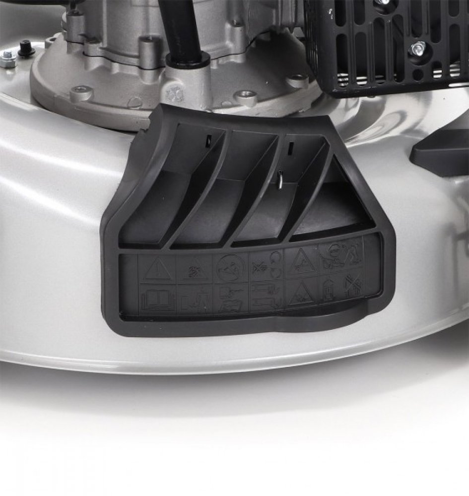 V extrémních podmínkách je možné otevřít kryt na straně šasi a nasadit deflektor bočního výhozu. Je to obzvláště efektivní, pokud máte vysokou, mokrou trávu. Výšku střihu trávníku můžete pohodlně zvolit pomocí samostatné páky centrálního nastavení výšky.