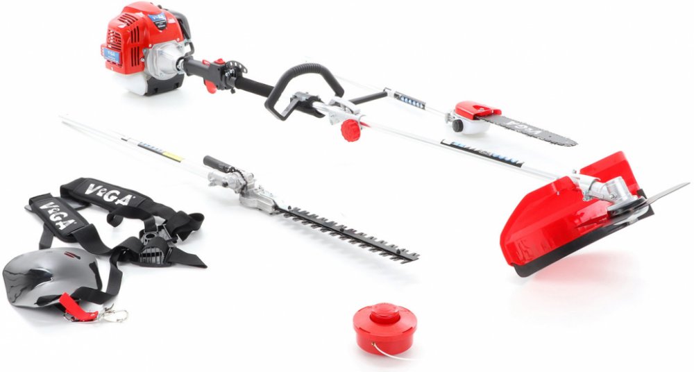 Víceúčelový benzínový křovinořez VeGA BCM520 4in1 s výkonem 2200 W a masivní konstrukcí je vybaven plotostřihem, vyvětvovací pilou 300 mm, strunovou hlavou 25,5 cm,