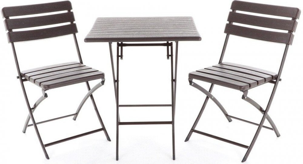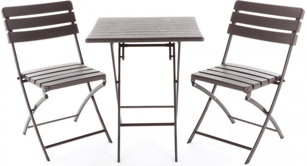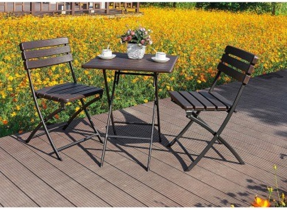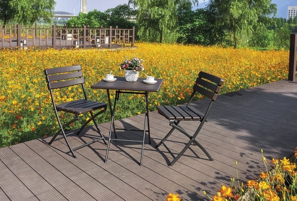 Stolová sestava dvou skládacích židlí z ocelových profilů povrchově dokončena komaxitovou barvou , čalounění je v imitaci masivního dřeva z lisovaného plastu s UV filtrem , určená do interiérů, exteriérů a pergolových prostor.