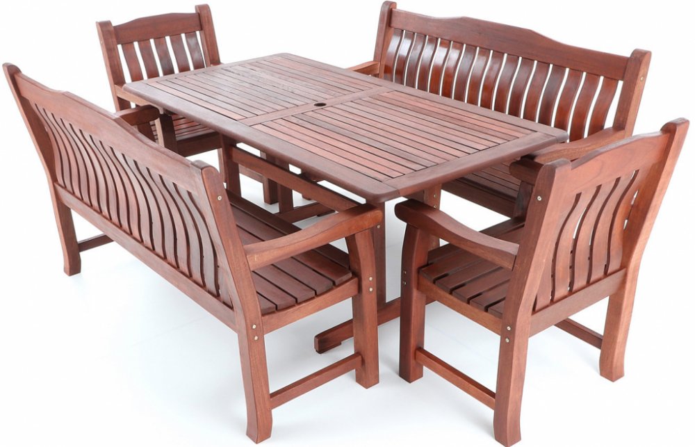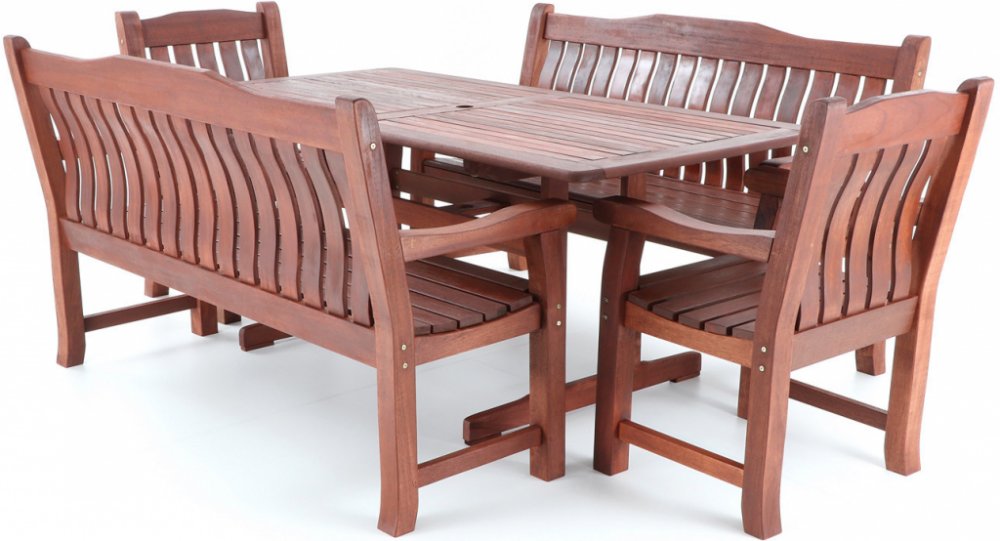 Luxusní masivní stolová sestava dvou křesel, dvou lavic a stolu z exotického, velice trvanlivého a tvrdého dřeva MERANTI. Dřevo o neuvěřitelné síle a velmi robustní konstrukce řadí tuto sestavu mezi nejmasivnějších výrobky ve své kategorii na trhu.