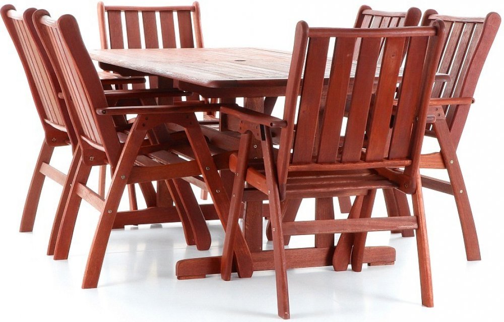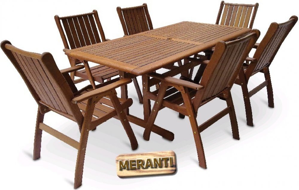 Luxusní masivní stolová sestava 6-ti křesel a stolu z exotického, velice trvanlivého a tvrdého dřeva meranti. Určeno do exteriérů, interiérů a pergolových prostor. Rozměry stolu: 180 x 90 x 74 cm Rozměr křesla: 61 x 64 x 87 cm Pokud chcete mít skutečně luxusní nábytek a ohromit Vaše známé, přátele nebo i rodinu, zvolte dřevinu Meranti. Tato dřevina Vás na první pohled upoutá svou atraktivní červenohnědou barvou a unikátní kresbou dřeva. Vyznačuje se velkou tvrdostí a dlouhou životností. Nábytek z Meranti se nemusíte bát nechat ve venkovním prostředí, protože je odolný proti povětrnostním podmínkám. A pokud o něj budete i náležitě pečovat, vydrží Vám spoustu let. Nábytek Meranti VICTORIA SET 6- je vyroben z tmavě červeného meranti. Meranti je označení pro více druhů dřevin z rodu Shorea pocházejících z jihovýchodní Asie. Meranti je nejžádanějším ztropických materiálů na výrobu zahradního nábytku. Tato dřevina našla své uplatnění jak v interiéru pro svůj dekorativní vzhled ( má unikátní červenohnědou barvu díky které na každém kusu nábytku dokonale vynikne kresba dřeva) ,ale především v exteriéru na výrobu zahradního nábytku, oken a dveří pro svoji vynikající trvanlivost, dlouhou životnost, vysokou tvrdost a dobrou opracovatelnost. Meranti VICTORIA SET 6 patří do značkové kolekce vyrobené z nejkvalitnější tmavě červené meranti o hustotě okolo 650 kg/m3. Nábytek je povrchově upraven bezbarvým teakovým olejem. Vzhledem k tomu, že nábytek je vyroben z přírodního materiálu, je kresba dřeva a jeho zbarvení na každém kusu nábytku unikátní. Dřevo meranti se ošetřuje teakovým olejem, který jej chrání před vysušením, vodou, škůdci nebo drobným poškozením. Zahradní nábytek Meranti VICTORIA SET 6 se vyznačuje atraktivním designem, robustní a ergonomickou konstrukcí a pečlivým zpracováním. Je vhodný jak pro domácí použití, tak i pro komerční použití, v prostorách s přístupem veřejnosti (např. hotely, restaurace, rekreační střediska a pod.) Nábytek je dodáván v rozebraném stavu zabalen do papírových kartonů s popisem zboží v angličtině od výrobce. Součástí dodávky je potřebný spojovací materiál, kování, imbusový nebo stranový klíč a jednoduchý montážní návod. Křesla jsou dodávána v rozloženém stavu. Luxusní masivní stolová sestava 6-ti křesel a stolu z exotického, velice trvanlivého a tvrdého dřeva meranti. Určeno do exteriérů, interiérů a pergolových prostor. Není vhodné pro používání ve vlhkém prostředí bez vhodné impregnace. Rozměry stolu: 180x90x74 cm, Rozměr křesla: 61x64x87 cm