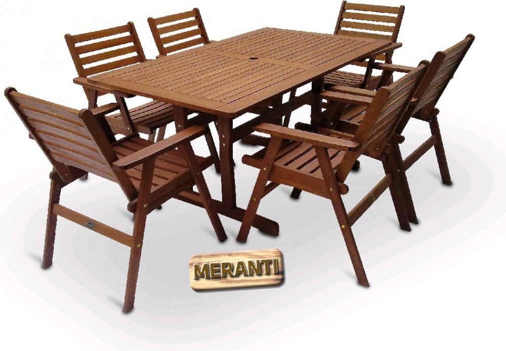 Luxusní masivní stolová sestava 6-ti křesel a stolu z exotického, velice trvanlivého a tvrdého dřeva meranti. Určeno do exteriérů, interiérů a pergolových prostor. Není vhodné pro používání ve vlhkém prostředí bez vhodné impregnace. Možno přiobjednat masivní podsedáky.