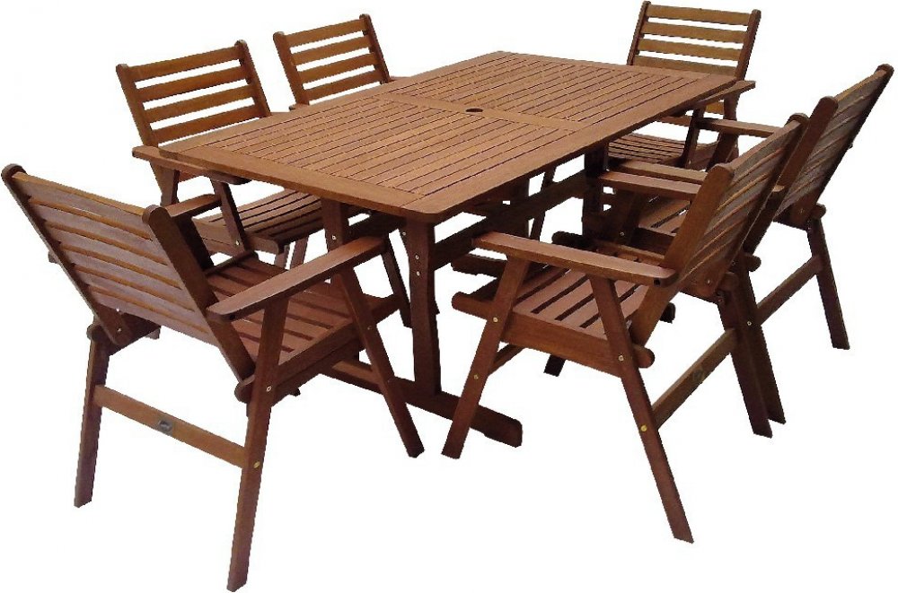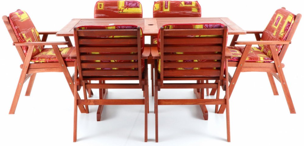 Luxusní masivní stolová sestava 6-ti křesel a stolu z exotického, velice trvanlivého a tvrdého dřeva meranti. Určeno do exteriérů, interiérů a pergolových prostor. Není vhodné pro používání ve vlhkém prostředí bez vhodné impregnace. Možno přiobjednat masivní podsedáky (tloušťka 6 cm) viz. ilustrační obrázek.