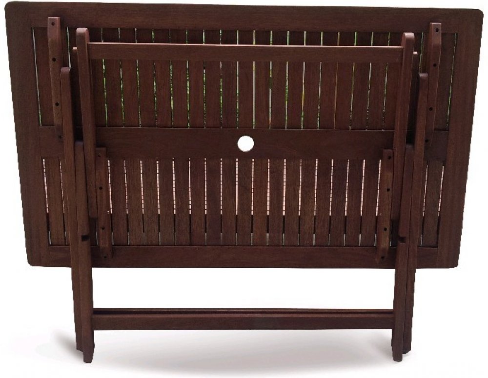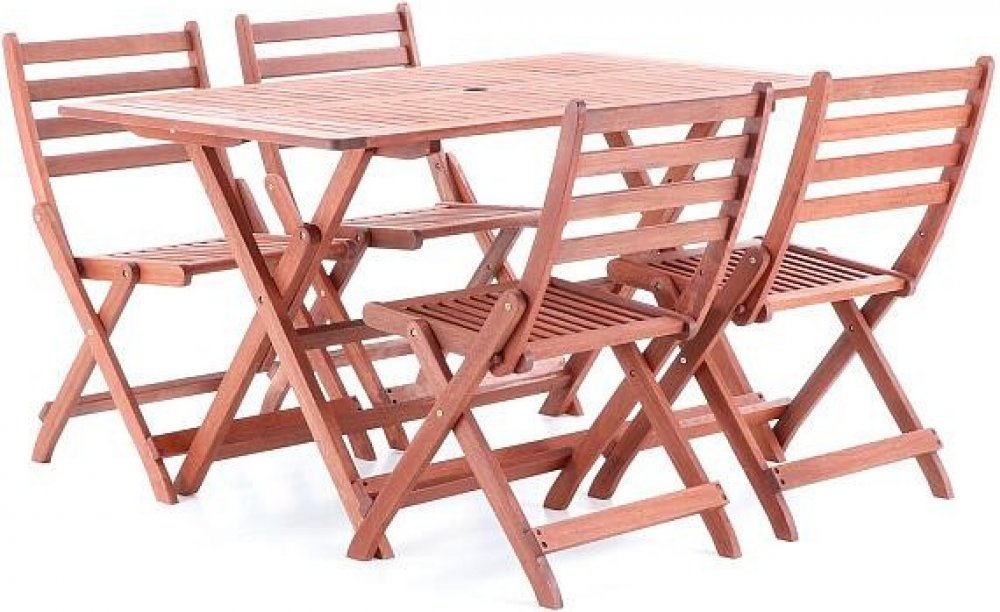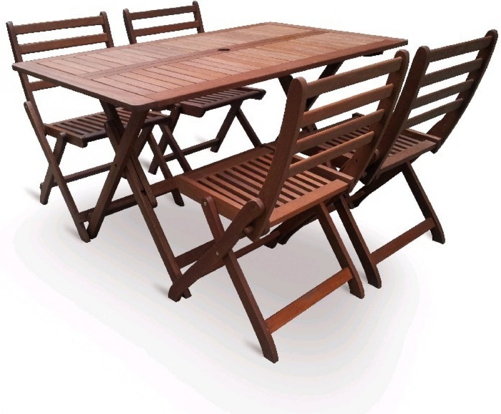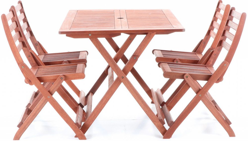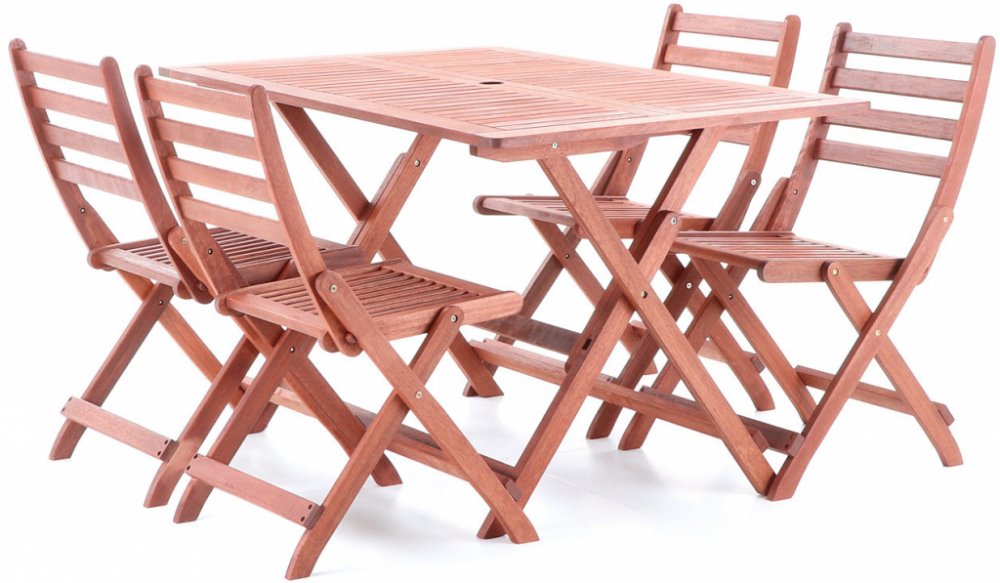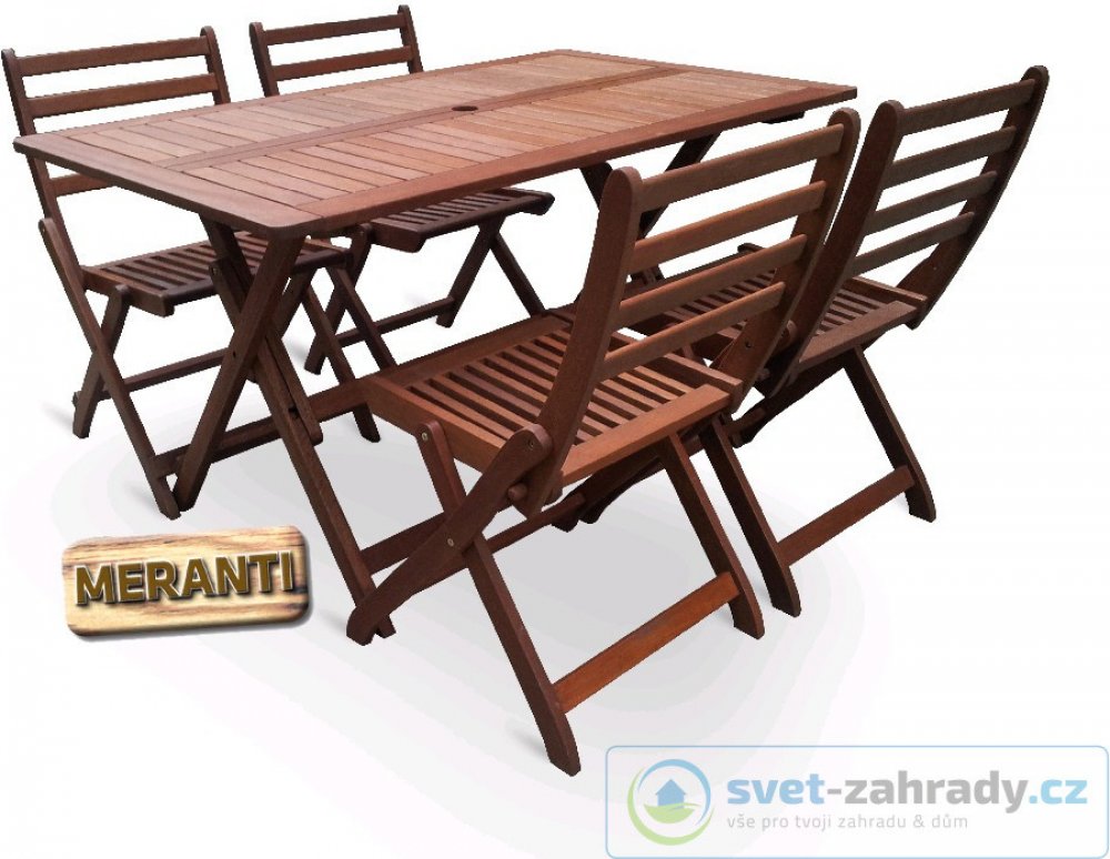 Masivní stolová sestava 4-ti skládacích židlí a skládacího stolu z exotického, velice trvanlivého a tvrdého dřeva meranti.