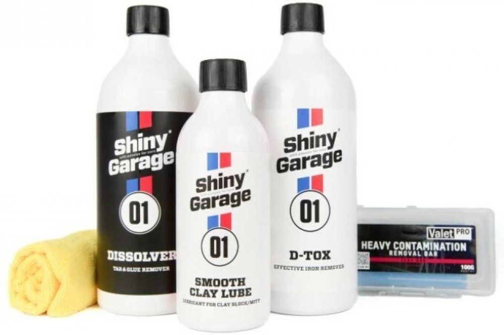 Sada na odstranění polétavé rzi a asfaltu z laku auta obsahuje odstraňovač, clay lubrikant a kvalitní utěrku pro šetrné čištění.