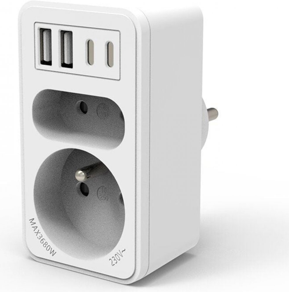 Proměňte svou běžnou elektrickou zásuvku v multimediální nabíjecí stanici! Velamp rozdvojka Vám nabízí 2 elektrické zásuvky + 4 zásuvky USB! Elektrické zásuvky jsou jedna velká 16A (2P+E) a jedna malá 6A. Maximální zatížení 3680 W. Pro připojení dvou zařízení současně. 2 zásuvky USB-A + 2 zásuvky USB-C: k připojení všech zařízení, která fungují na zásuvce USB: telefon, budík, tablet, lampa, rádio....