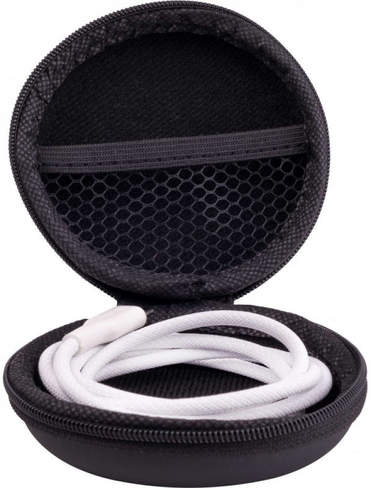 Vnitřek obalu je vybaven polstrováním a elastickým pasem, které udržují obsah pevně na místě, což je výhodou při transportu. Tento praktický a kompaktní obal poskytuje řešení pro ty, kteří chtějí mít svá sluchátka a kabely vždy po ruce a v bezpečí.