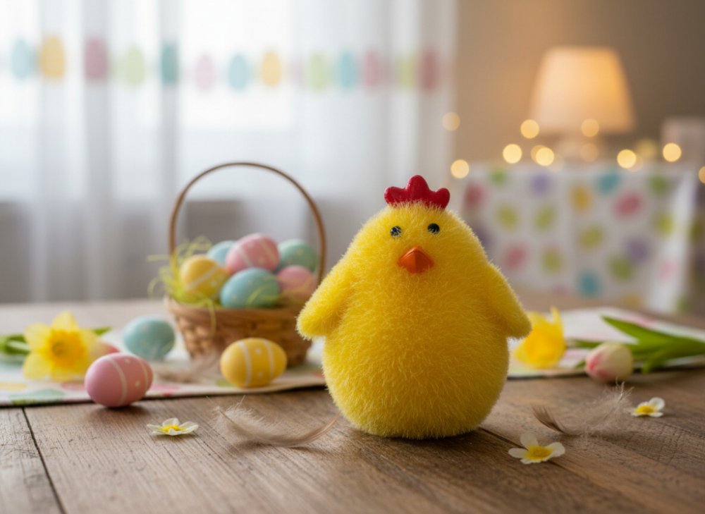 Kuřátko je téměř povinnou součástí velikonočního aranžmá. Rozkošná figurka bude dokonalým doplňkem každé velikonoční kompozice. Díky žlutému chmýří, černým očím a zaoblenému tvaru vypadá kuřátko mimořádně přátelsky a přitahuje pozornost nejen dětí, ale i dospělých. Díky svým výrazným barvám figurka dokonale podtrhne radostnou velikonoční náladu a vnese do interiéru jarní auru.