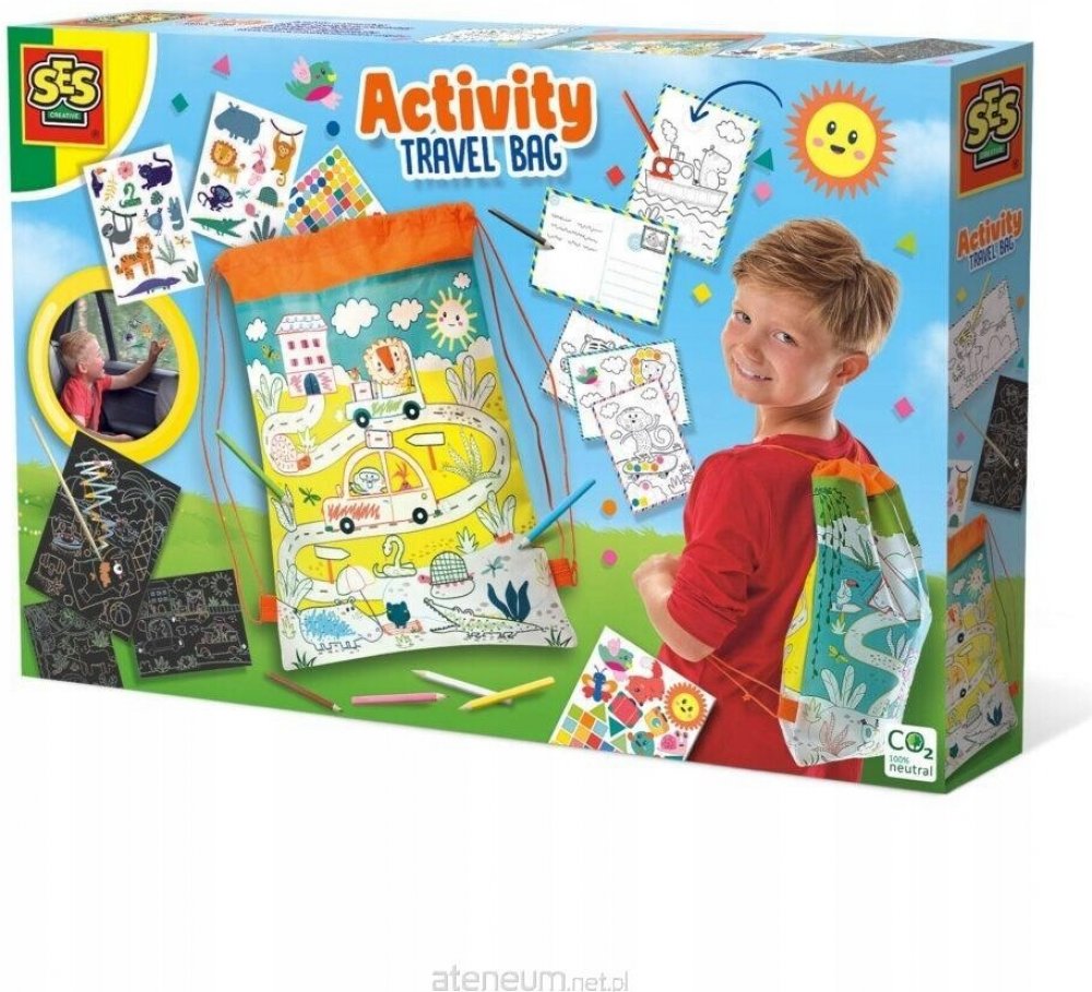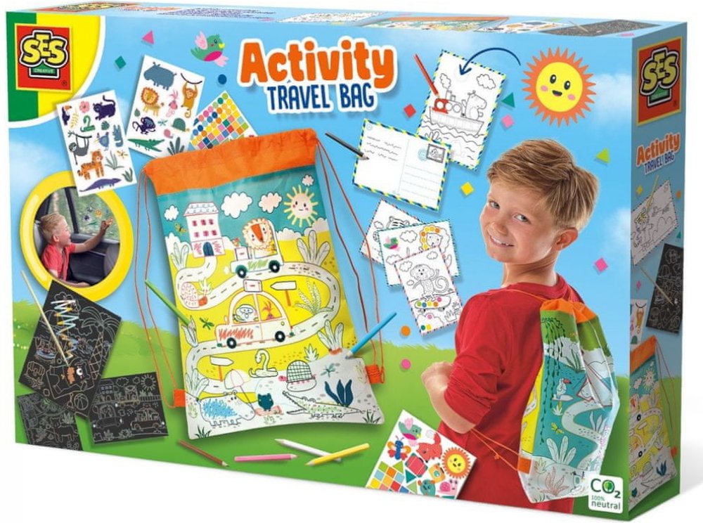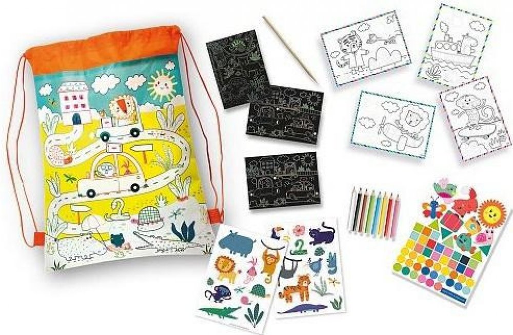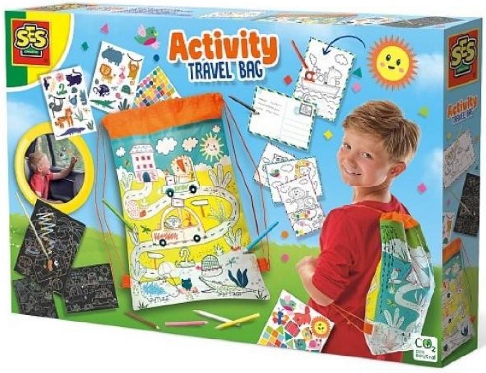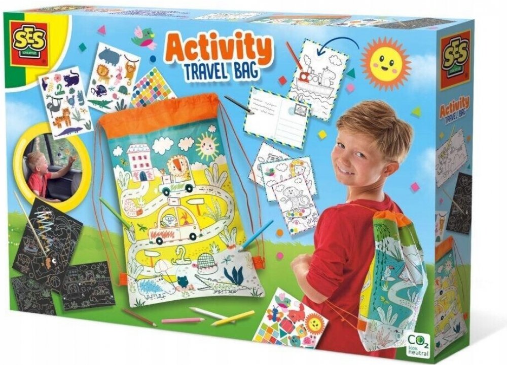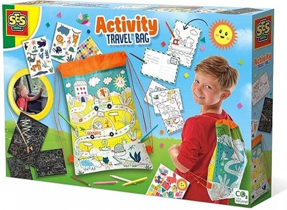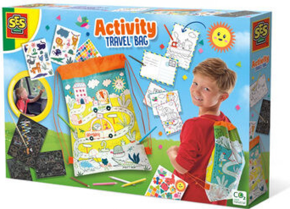 S cestovní taškou je jednodenní výlet nebo dovolená mnohem zábavnější! Cestovní batoh je plný různých věcí. Bavte se se stíracími losy, pohlednicemi, které si můžete vybarvit, tužkami, mozaikovými samolepkami a samolepkami na okna! A možná nejlepší: můžete si natřít i cestovní batoh! Travel Activity Backpack je batoh, který si můžete vybarvit a obsahuje tři stírací cedule, různé samolepky, pastelk...